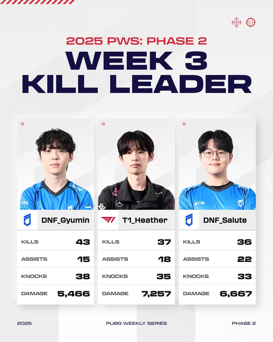 PUBG电竞韩国社媒更新:PWS第三周杀人榜前三
