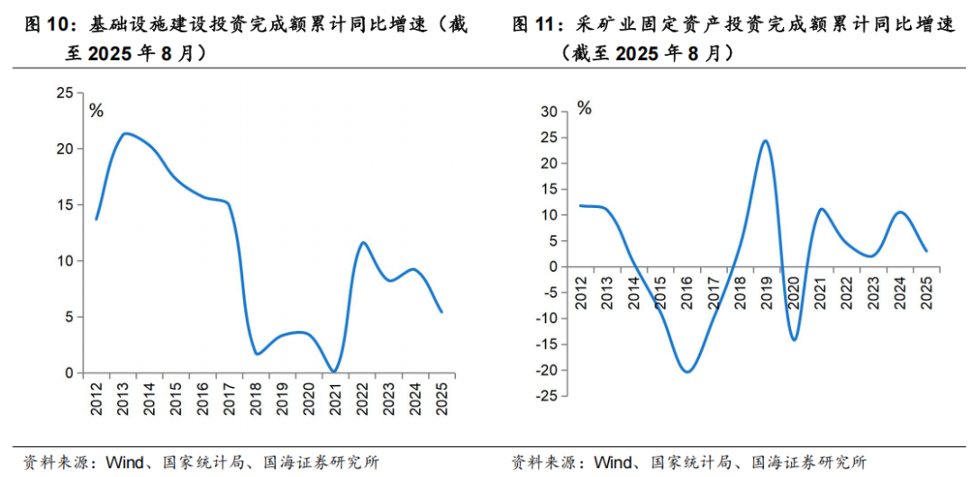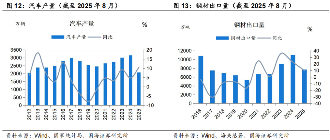 从下游来看,1-8月相较1-7月,钢材出口同比增速下降,基建、制造业投资略有放缓,地产依然低迷。2025年1-8月基建投资完成额同比+5.42%,增速较1-7月下降1.87pct,房地产开发投资完成额1-8月同比-12.90%,降幅较1-7月扩大0.90pct,房屋新开工面积1-8月同比-19.50%,降幅较1-7月扩大0.10pct。此外,2025年1-8月,制造业投资同比+5.10%,增速较1-7月放缓1.10pct,钢材出口1-8月同比+10.00%,增速较1-7月下降1.40pct。