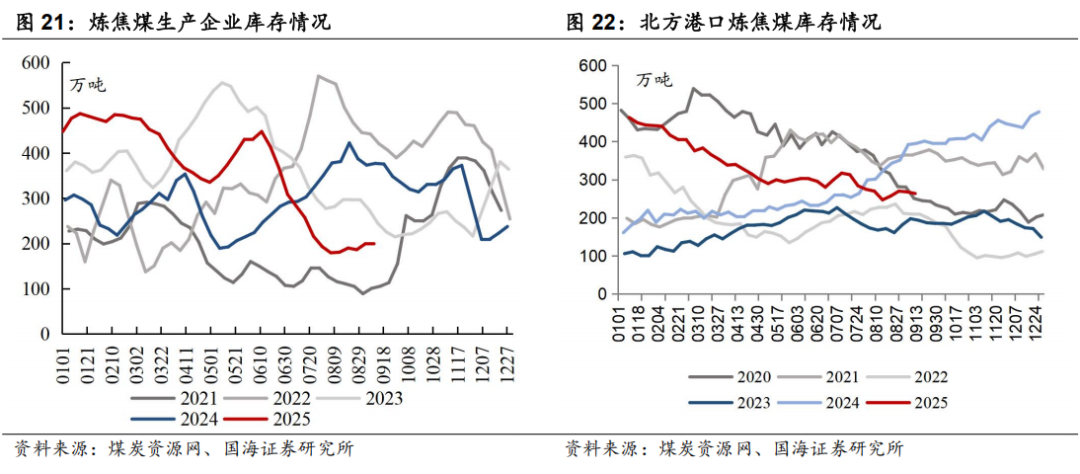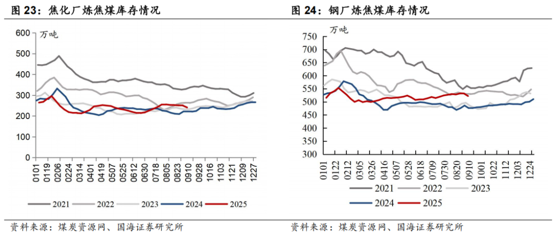 炼焦煤库存:焦煤生产企业库存仍处较低水平。2025年8月底较月初,炼焦煤生产企业库存环比增加6.85万吨至186.15万吨,但仍处于较低水平;焦化厂炼焦煤库存减少4.71万吨至251.09万吨;钢厂炼焦煤库存增加5.05万吨至524.41万吨。