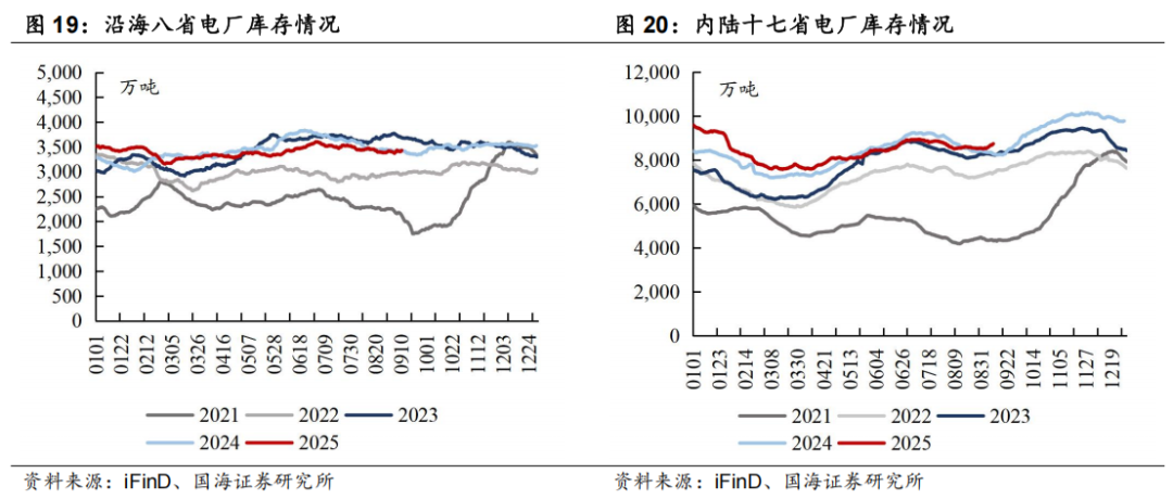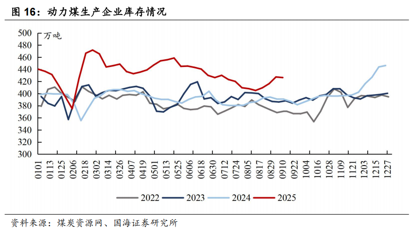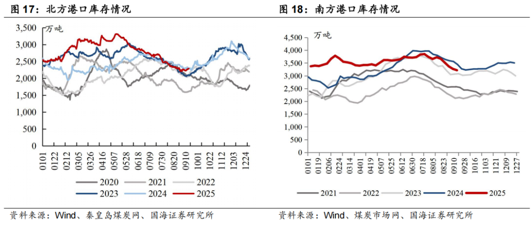 库存,动力煤库存:北方港口库存去化流畅。2025年8月末,动力煤生产企业库存较月初(下同)提升8.3万吨至416.40万吨;北方港口动力煤库存减少250.50万吨至2,223.20万吨,去库效果较佳,同比去年同期减少143.3万吨;沿海八省电厂库存降低85.5万吨至3,412.20万吨;内陆十七省电厂库存降低202.6万吨至8,526.30万吨。
