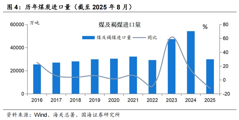 进口方面:8月煤炭进口同比-6.77%,降幅较7月收缩16pct。2025年8月,我国进口煤炭4,273.70万吨,同比减少7%,降幅较2025年7月收缩16pct,受国内煤价提升影响,部分进口煤性价比略有修复,迎峰度夏期间旺季用煤亦有支撑,但整体进口依然具备约束力,8月进口仍低于去年同期。2025年1-8月煤炭进口3.0亿吨,同比-12.20%。按照2025年8月国内产量同比增速-3.20%以及进口量同比增速-6.77%来计算,2025年8月国内煤炭供应同比增速为-3.6%(供应增速测算未考虑热值变化),降幅较7月收窄1.9pct。