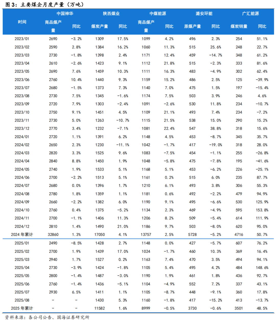 生产方面:8月原煤生产同比-3.20%,降幅较7月收窄0.60pct。2025年8月,规上工业原煤产量3.9亿吨,同比减少3.20%,降幅相较7月收窄0.60pct,应主要系迎峰度夏期间,旺季用煤支撑所致。2025年8月,规上工业原煤日均产量为1,260万吨,月度环比增加30.7万吨/天,同比减少19.5万吨/天。1-8月,规上工业原煤产量31.65亿吨,累计同比增长2.80%,累计同比增速相较1-7月降低1.00pct。样本大型煤企8月煤炭生产分化。我们以中国神华、陕西煤业、中煤能源、潞安环能、广汇能源为样本。2025年8月,陕西煤业煤炭产量为1430万吨,同比+5.3%;中煤能源煤炭产量为1160万吨,同比-1.8%;潞安环能原煤产量为417万吨,同比-15.2%。整体看,样本公司煤炭产量同比分化。