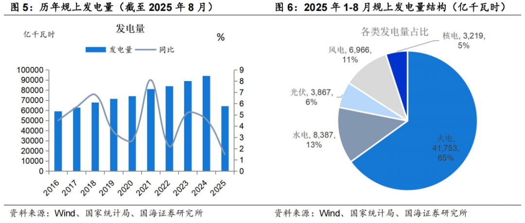 8月规上工业火电同比+1.7%,同比增速较7月放缓2.6pct。规上工业电力生产平稳增长。8月份,规上工业发电量9363亿千瓦时,同比增长1.6%;日均发电首次突破300亿千瓦时,达302.0亿千瓦时。1—8月份,规上工业发电量64193亿千瓦时,同比增长1.5%,扣除天数原因,日均发电量同比增长1.9%。分品种看,8月份,规上工业风电增速加快,水电降幅扩大,火电、核电、太阳能发电增速放缓。其中,规上工业火电同比增长1.7%,增速比7月份放缓2.6个百分点;规上工业水电下降10.1%,降幅比7月份扩大0.3个百分点;规上工业核电增长5.9%,增速比7月份放缓2.4个百分点;规上工业风电增长20.2%,增速比7月份加快14.7个百分点;规上工业太阳能发电增长15.9%,增速比7月份放缓12.8个百分点。1-8月,规上工业火电累计同比下降0.80%,降幅比1-7月收窄0.50个百分点;规上工业水电累计同比下降5.50%,降幅比1-7月扩大1.00个百分点;规上工业核电累计同比增长10.10%,增速比1-7月放缓0.70个百分点;规上工业风电累计同比增长11.60%,增速比1-7月加快1.20个百分点;规上工业太阳能发电累计同比增长23.40%,增速比1-7月加快0.70个百分点。