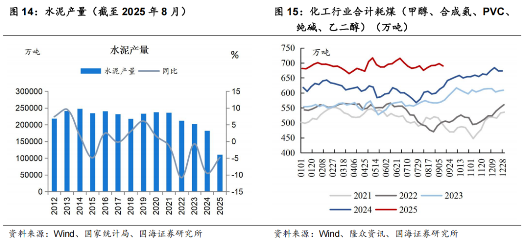 2025年8月,全国水泥产量1.5亿吨,同比-6.20%,同比降幅相较7月扩大0.60pct;2025年8月化工行业合计耗煤(甲醇、合成氨、PVC、纯碱、乙二醇)3433.12万吨,同比+15.14%,同比增速较7月下降2.74pct。