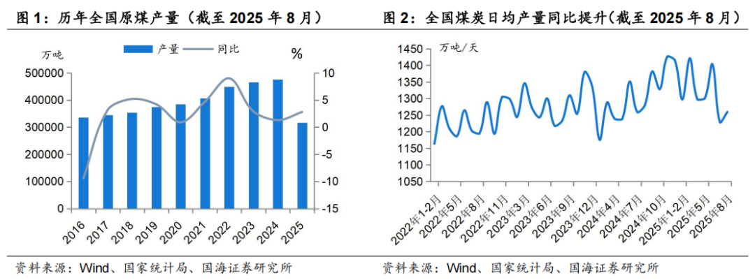 8月原煤生产同比-3.20%,降幅较7月收窄0.60pct。2025年8月,规上工业原煤产量3.9亿吨,同比-3.20%,降幅相较7月收窄0.60pct,应主要系迎峰度夏期间,旺季用煤支撑所致。2025年8月,规上工业原煤日均产量为1,260万吨,月度环比增加30.7万吨/天,同比减少19.5万吨/天。1-8月,规上工业原煤产量31.65亿吨,累计同比+2.80%,累计同比增速相较1-7月降低1.00pct。