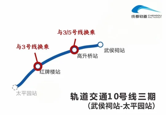 2️⃣地铁10号线三期起于人民公园站,止于太平园站,全长5.87公里。此次10号线三期开通运营范围为武侯祠站-太平园站,剩余2个车站(文翁石室站、人民公园站)暂不开通。其中红牌楼站可换乘3号线,高升桥站可换乘3号线和5号线。