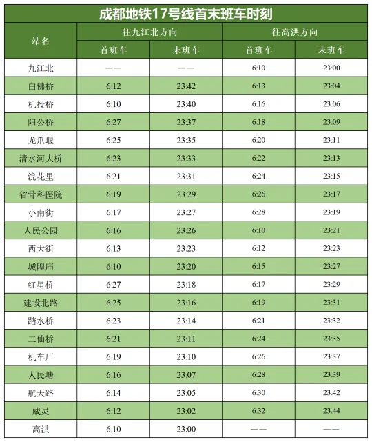 17号线二期开通后,九江北站首班车时间为6:10、末班车时间为23:00,高洪站首班车时间为6:10、末班车时间为23:00。