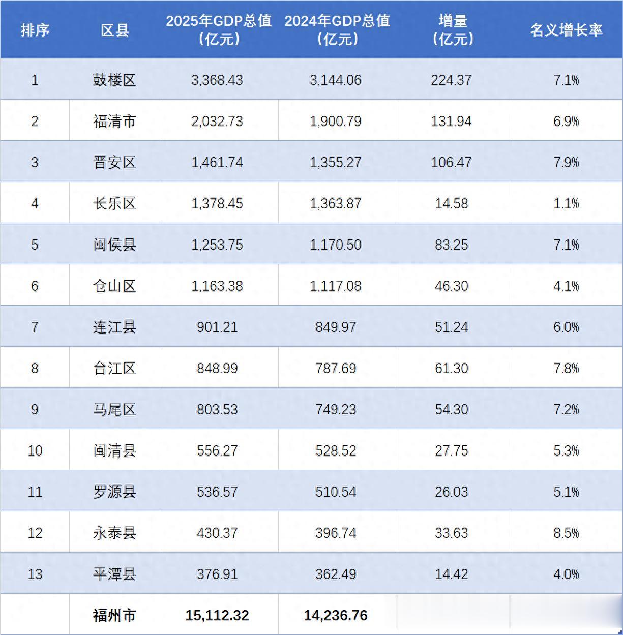 鼓楼区是福州市经济总量扛把子,2025年全年GDP总值达到了3368.43亿元,是全市唯一一个超3000亿元的地区,远超其他区县,稳居全市之首。不仅总量遥遥领先,鼓楼区同比表现亦属良好,其GDP名义增速达到了7.1%,高于全市平均水平,在各区县之中也较为靠前,期待接下来能够继续保持,争取实现更大突破。