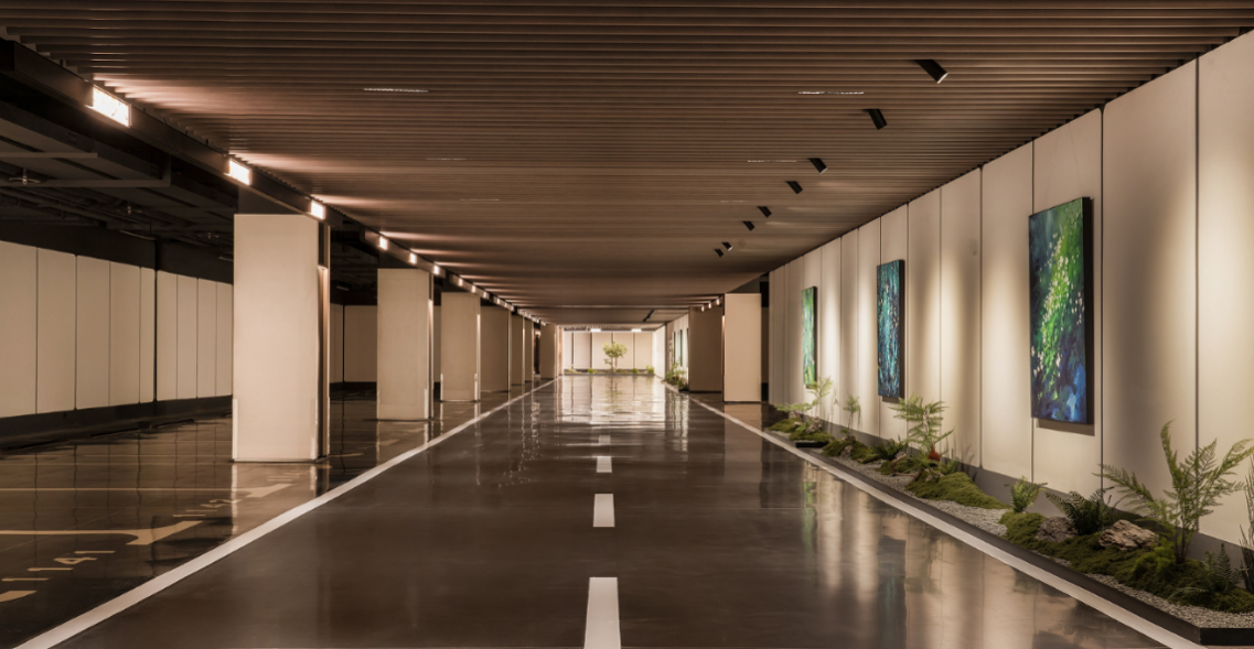 项目建筑以现代简约风格为基调,将大面积超白玻与暖色石材、金属结构相结合,在不同光照条件下折射出富有韵律的光影变化。更为引人注目的是对社区空间的整体营造:从以贝母艺术穹顶为亮点的社区大堂,经由精心设计的景观廊道,延伸至镜面水景与开阔草坪构成的核心园林。地下车库更是以高奢酒店环境为设计标准,营造出尊贵的归家礼序与隐逸体验。