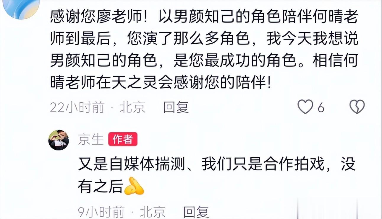 不知情的人点开评论区,恐怕会真以为廖京生是何晴的丈夫,正深陷丧妻的悲痛中。