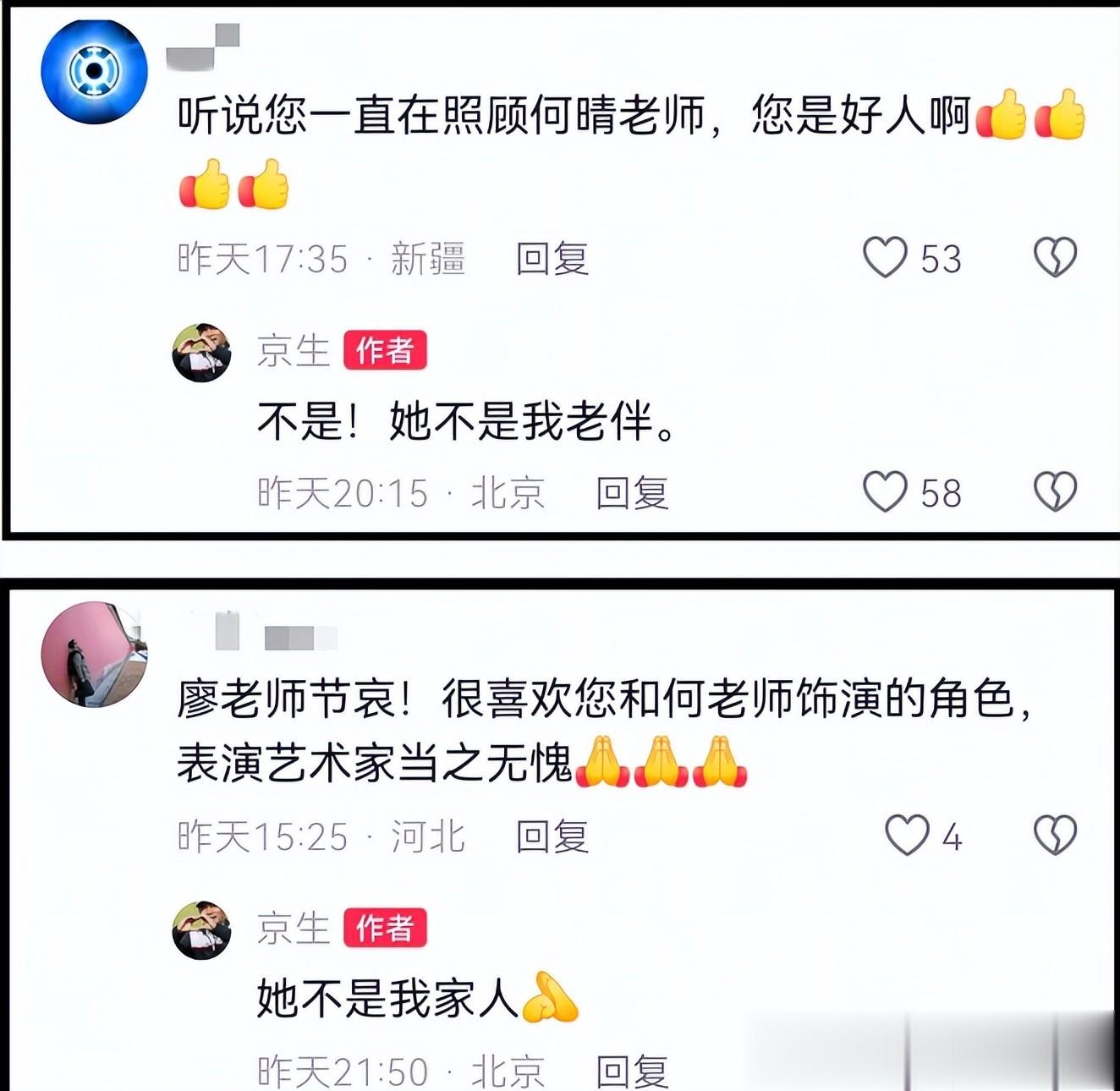 廖京生看着社交账号下满屏的“请节哀”、“感谢您十年照顾何晴老师”,只能无奈地再次回复:“她不是我老伴,不是我的家人。”