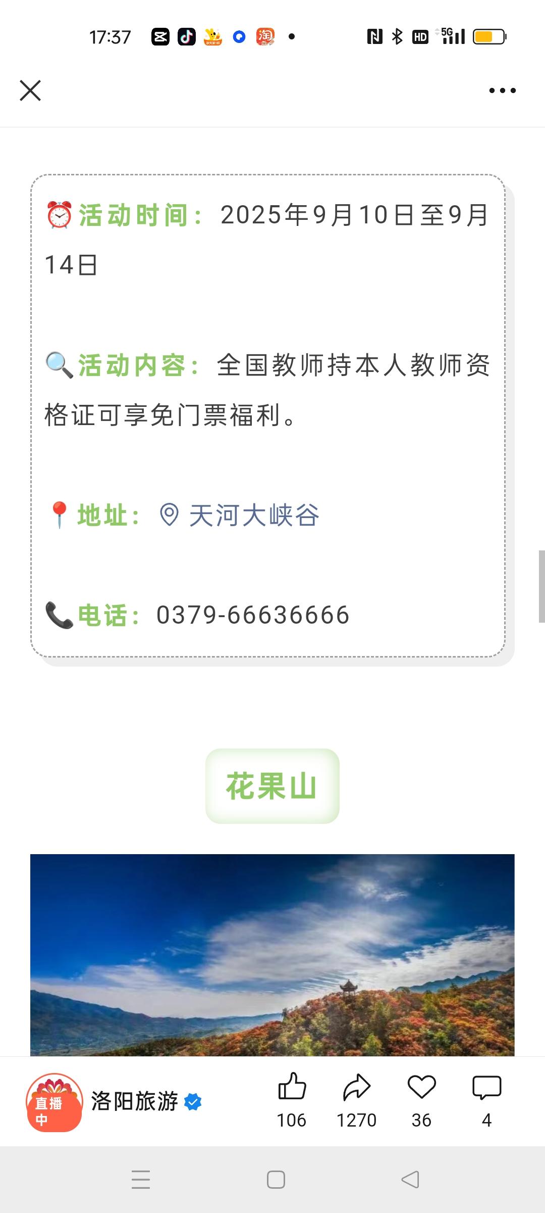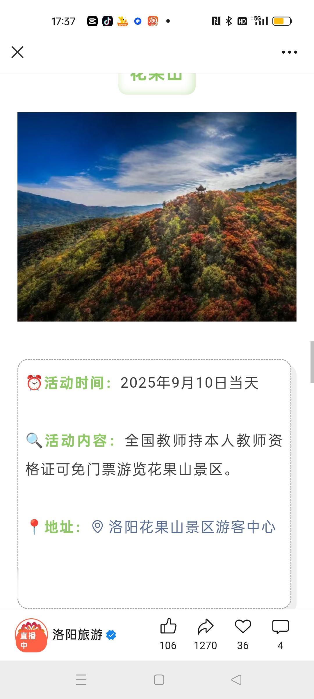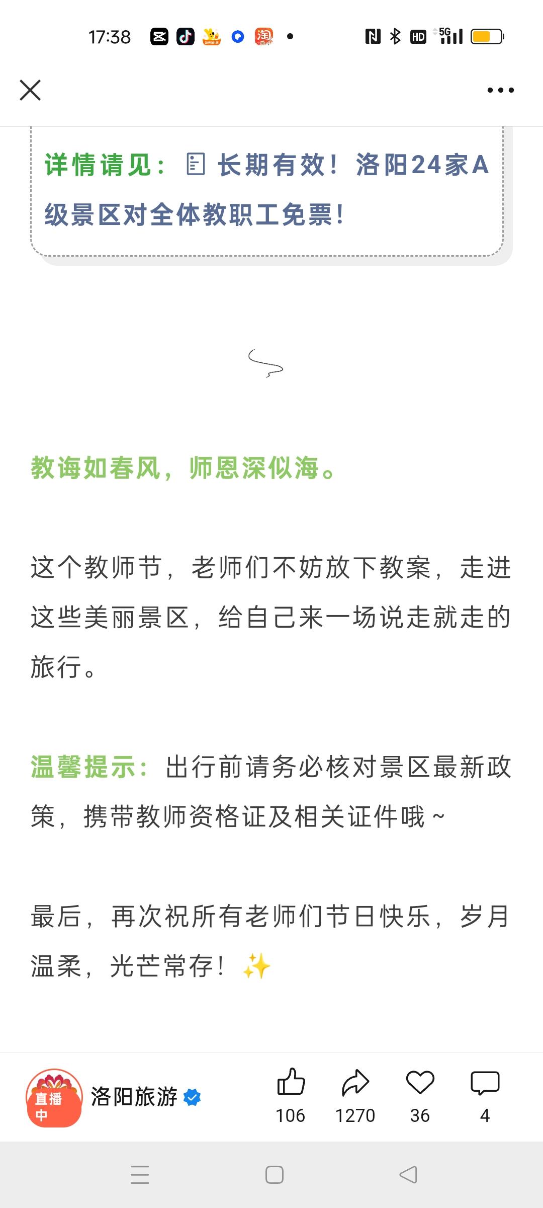 洛阳旅游景区对全国教师的优惠你收到了吗?一支粉笔,书写人生几十载三尺讲台,孕育桃李满天下 洛洛祝所有的老师节日快乐一直以来默默奉献的你们辛苦啦 为感谢师恩洛阳多家景区纷纷推出 免门票、优惠游等福利 (部分活动持续至周末)向辛勤耕耘的老师们送上最诚挚的祝福。