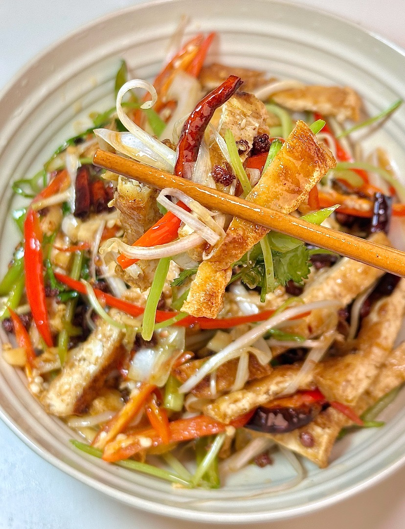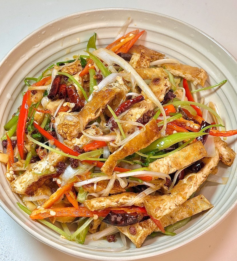这道凉拌炸豆腐丝的精髓在于“脆”与“香”的结合,煎好的豆腐丝外皮酥脆,吸收料汁后仍能保持一定的嚼劲,配菜的爽脆和料汁的麻辣鲜香完美融合。做好的菜品色泽诱人,麻辣扑鼻,一口下去,豆腐的焦香、蔬菜的清甜和料汁的麻辣在嘴里交织,无论是作为佐粥小菜,还是配饭、配面的搭档,都能让人食欲大开。