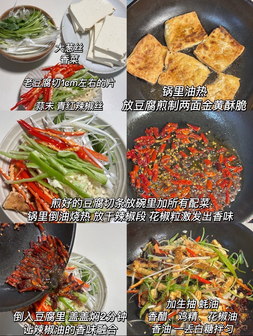 想要做好这道菜,第一步就是备好食材。根据图片中的搭配,核心食材是老豆腐、大葱丝、香菜、青红辣椒丝、蒜末,还有必不可少的干辣椒段和花椒粒。老豆腐要选质地紧实的,这样的豆腐煎出来外皮酥脆、内部仍能保持嫩滑;大葱丝和香菜要切得细一些,既能增加口感层次,又能提升辛香气;青红辣椒丝不仅能配色,还能增加一丝清辣的风味,所有食材提前准备好,拌菜时才能一气呵成——这可是“风味融合”的前提。