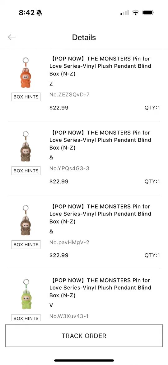 终于抢到一次,买七个给我四个& ,都是丑东西。。。神马意思啊泡泡玛特!!! 据说像小耗子一样。。。我裂开了,蓝瘦香菇[哭惹R] 我正在研究怎么cancle order的时候它迅速给我发货了,正愁这些丑东西卖不出去呢吧,来个大冤鬼一下收了四个赶紧给她发货。。。 想要S,N,M,E,C,L 湾区有要换的姐妹吗[捂脸R][捂脸R][捂脸R]