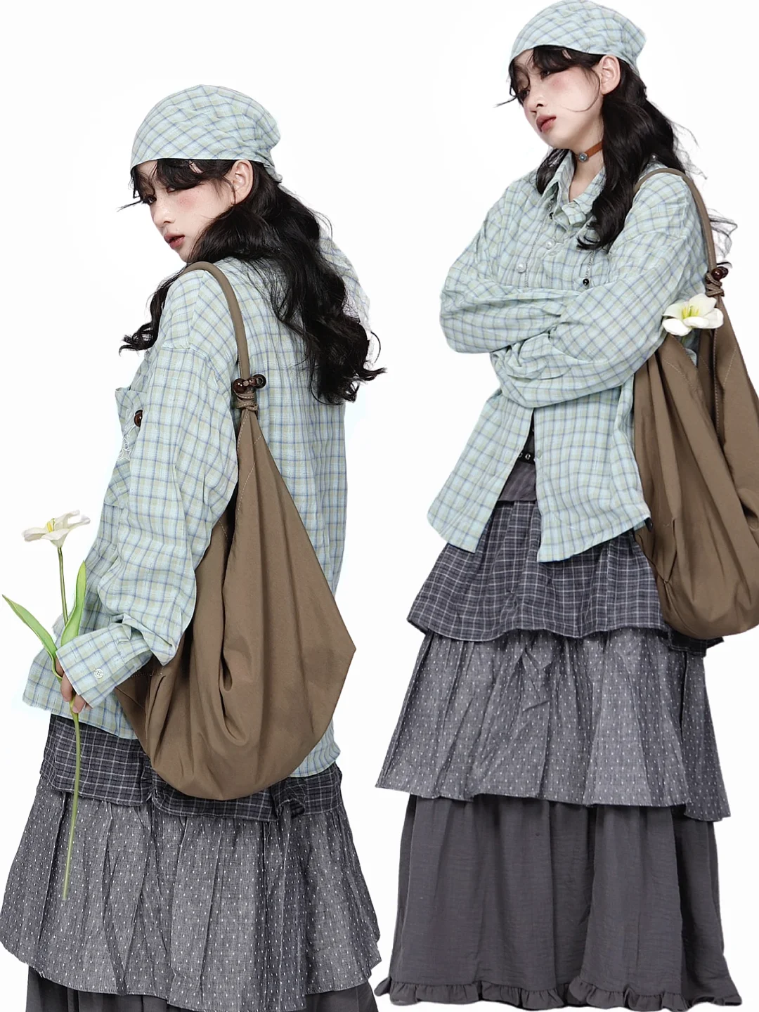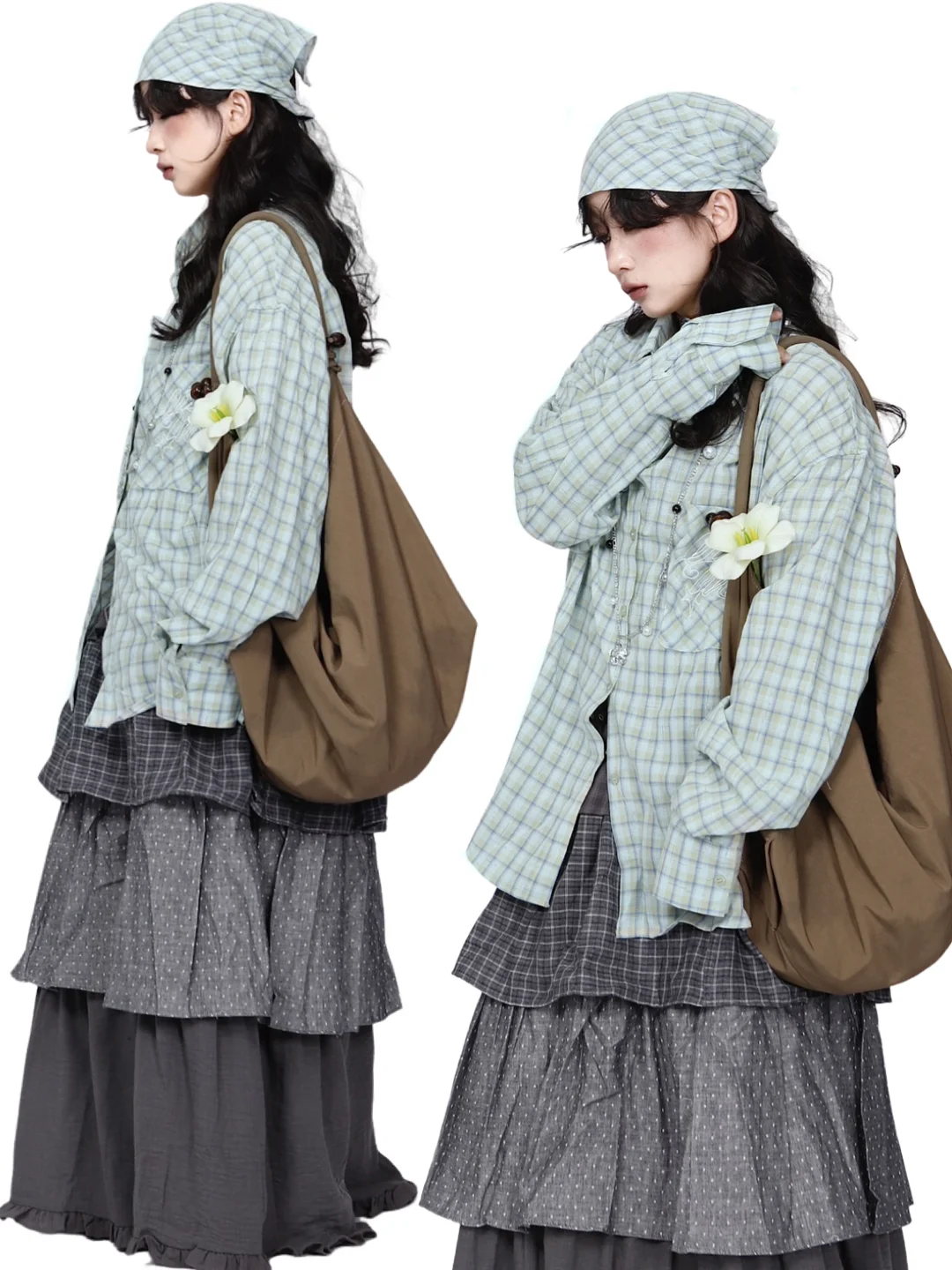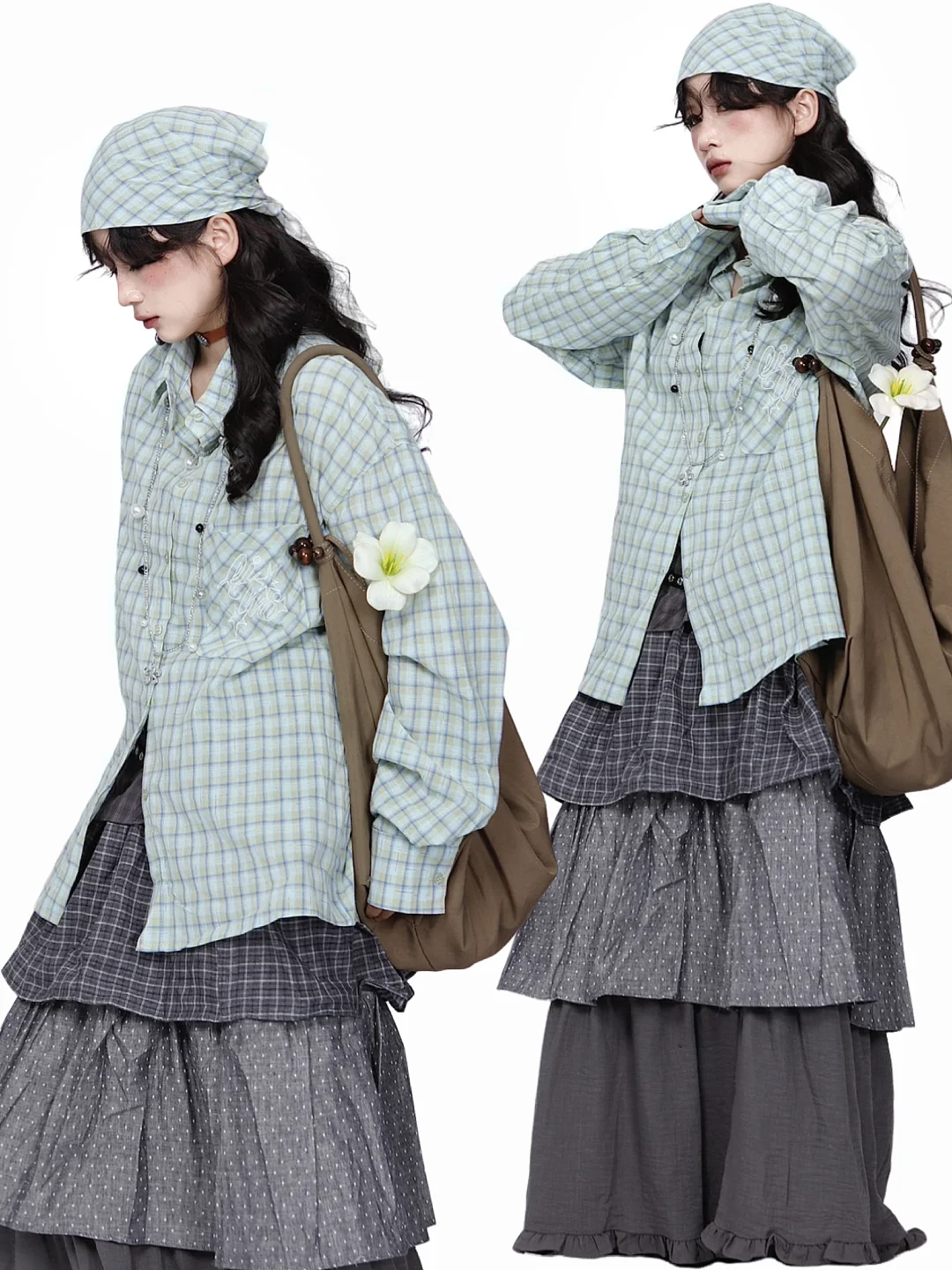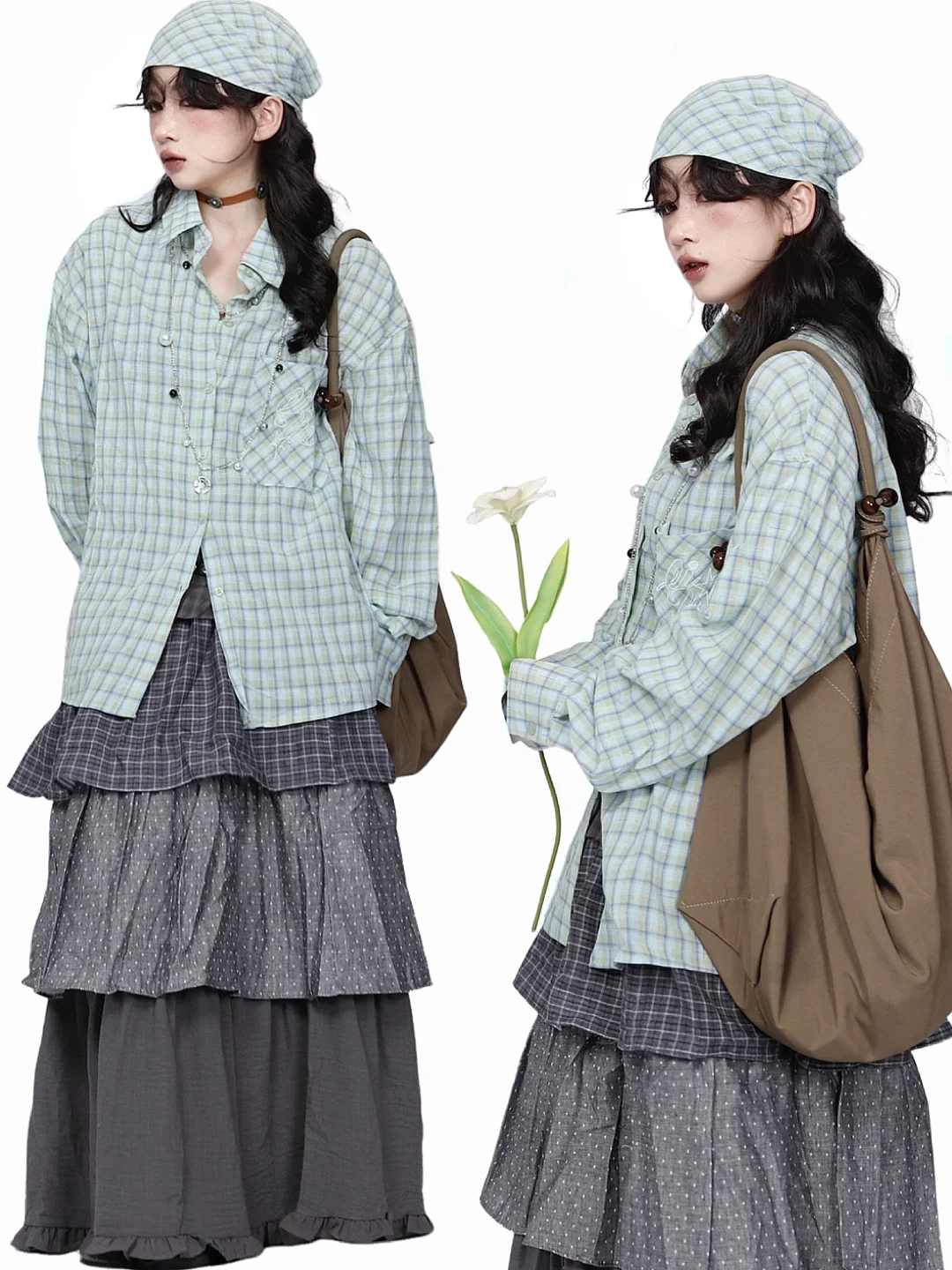复古艺术生look*🩵薄荷绿格子衬衫➕多层裙