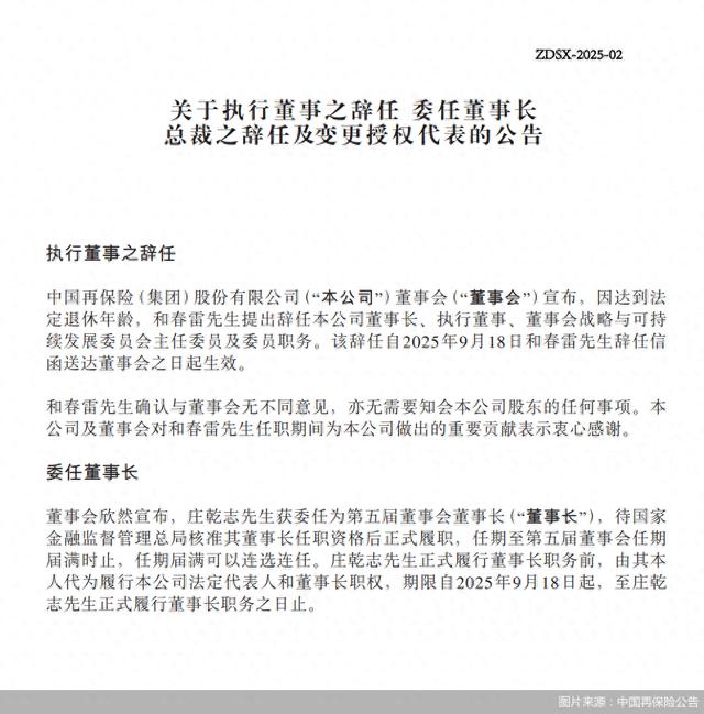 中国再保险表示,庄乾志获委任为第五届董事会董事长,待监管核准其董事长任职资格后正式履职,任期至第五届董事会任期届满时止,任期届满可以连选连任。庄乾志正式履行董事长职务前,由其本人代为履行公司法定代表人和董事长职权,期限自2025年9月18日起,至庄乾志正式履行董事长职务之日止。因工作安排,庄乾志自2025年9月18日起不再担任公司总裁。庄乾志将作为临时负责人代行公司总裁职权,期限自2025年9月18日起,至公司新任总裁正式履职之日止。