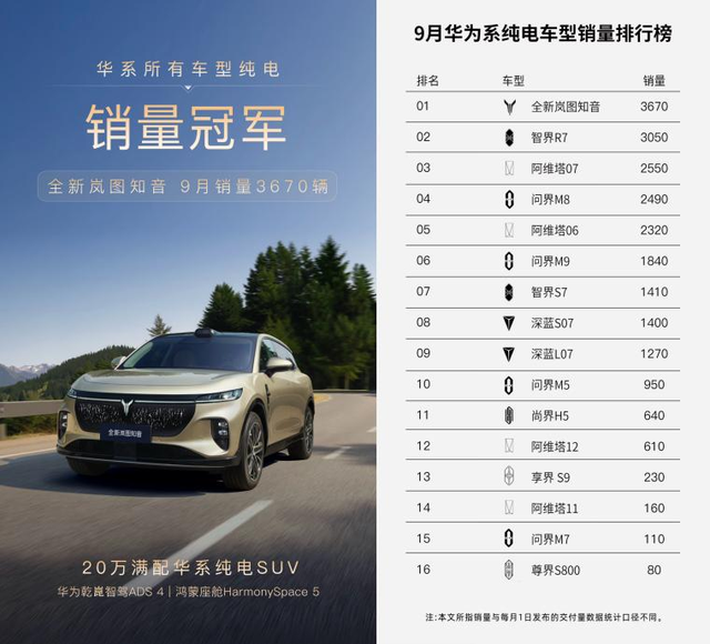 然而,一匹黑马从侧翼杀出:“20万满配华为纯电SUV”全新岚图知音以3670辆的成绩空降榜首,成为华为系纯电车型的销量冠军。这场“内卷”背后,是华为技术加持下,产品定位、价格与用户需求的激烈碰撞。
