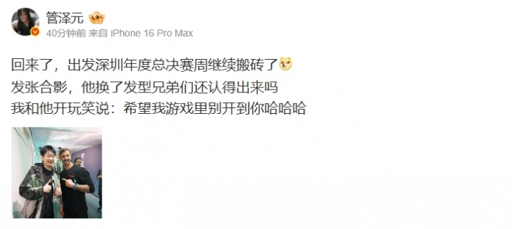 直播吧9月19日讯管泽元更博晒与古蒂合照,并配文:回来了,出发深圳年度总决赛周继续搬砖了。发张合影,他换了发型兄弟们还认得出来吗,我和他开玩笑说:希望我游戏里别开到你哈哈哈。