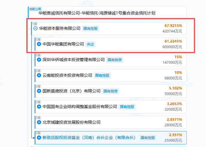华能信托官网显示,该公司是由国务院国资委所辖央企——中国华能集团有限公司的控股子公司华能资本服务有限公司控股(持有华能信托67.92%的股份),贵州省及国内多家大型国有企业参股的全国性信托金融机构。