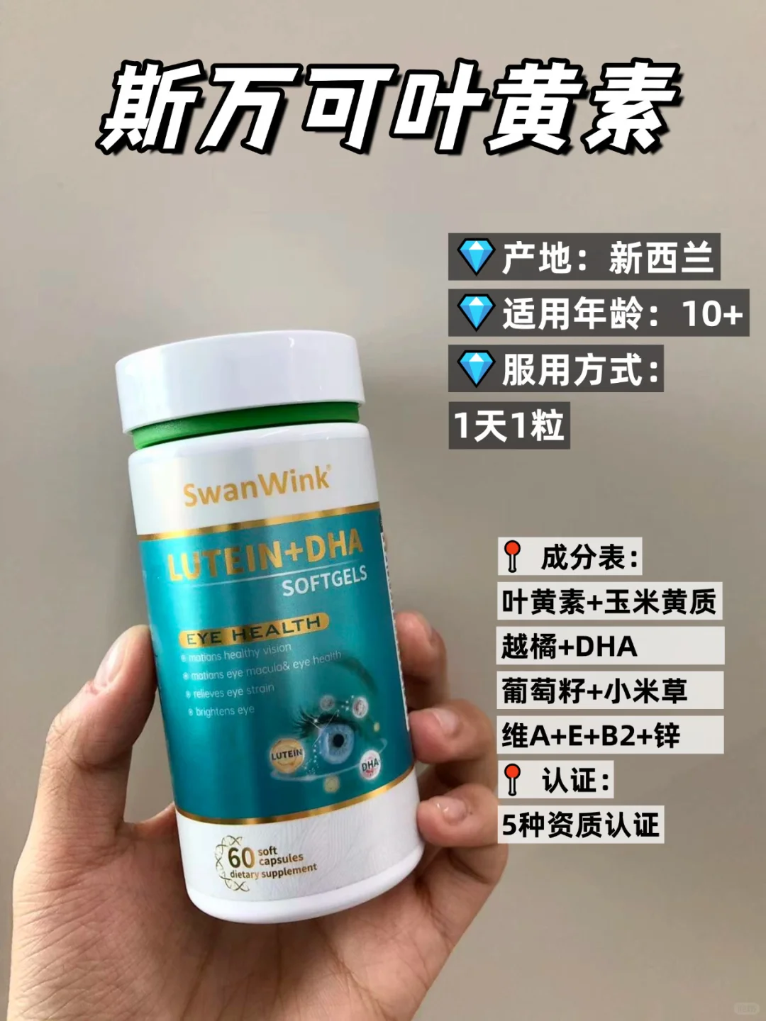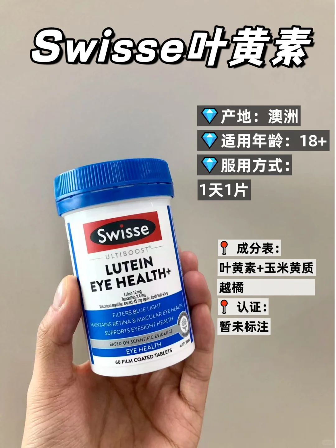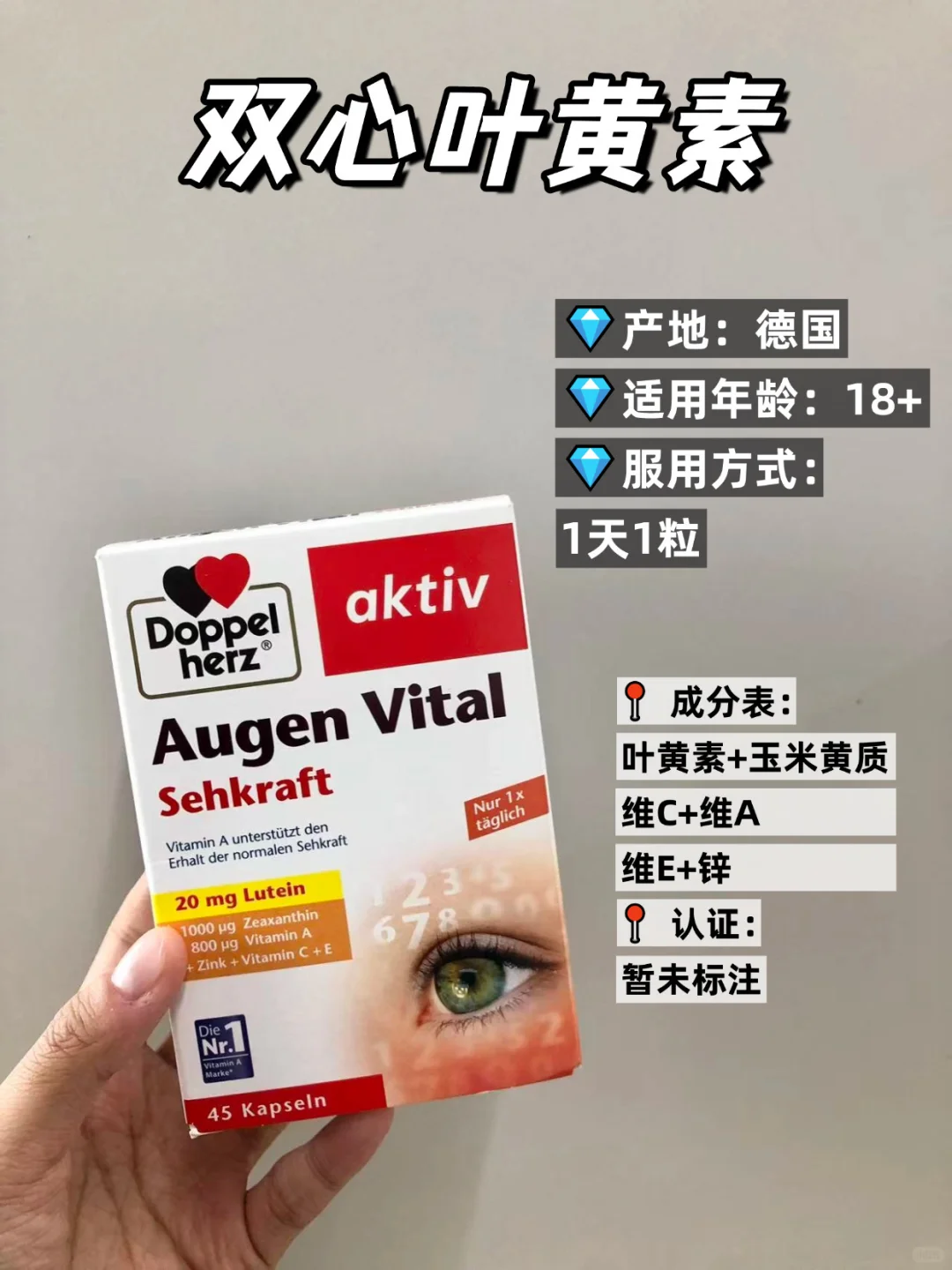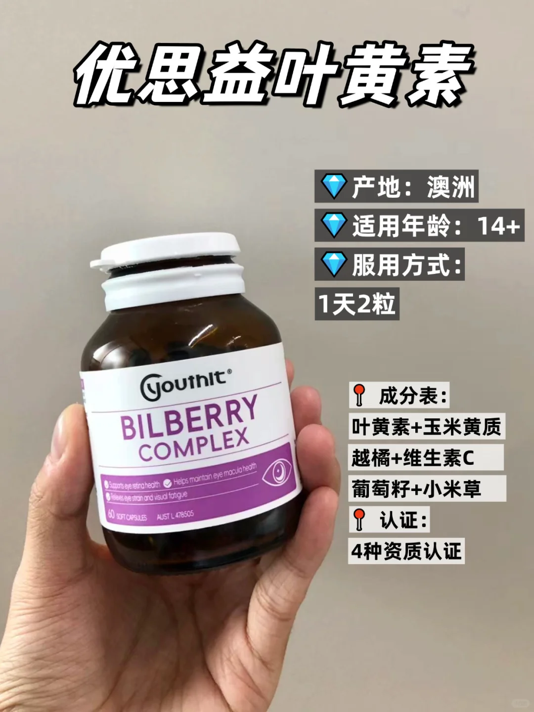 澳洲的一款,注意放置冰箱保存,玻璃瓶身轻拿轻放,每天2粒温水吞服,适合用眼不频繁的日常补充。