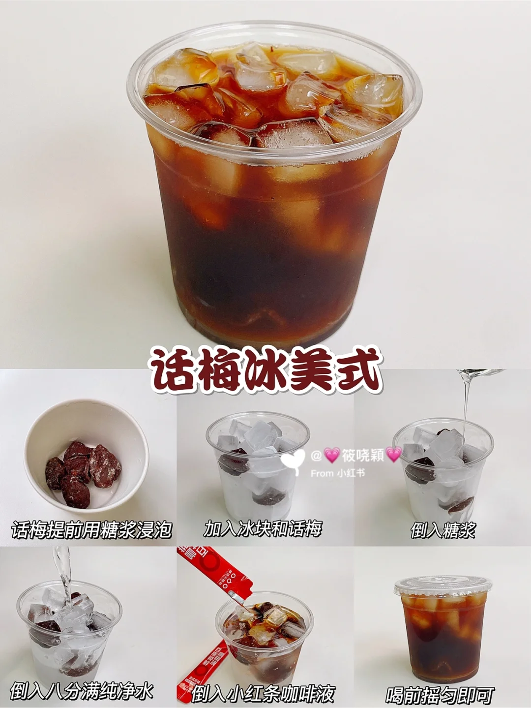 🔸做法:话梅提前用糖浆浸泡,杯中加入冰块和话梅,倒入糖浆,加入纯净水八分满,最后加入小红条咖啡液,喝一次就爱上的味道!