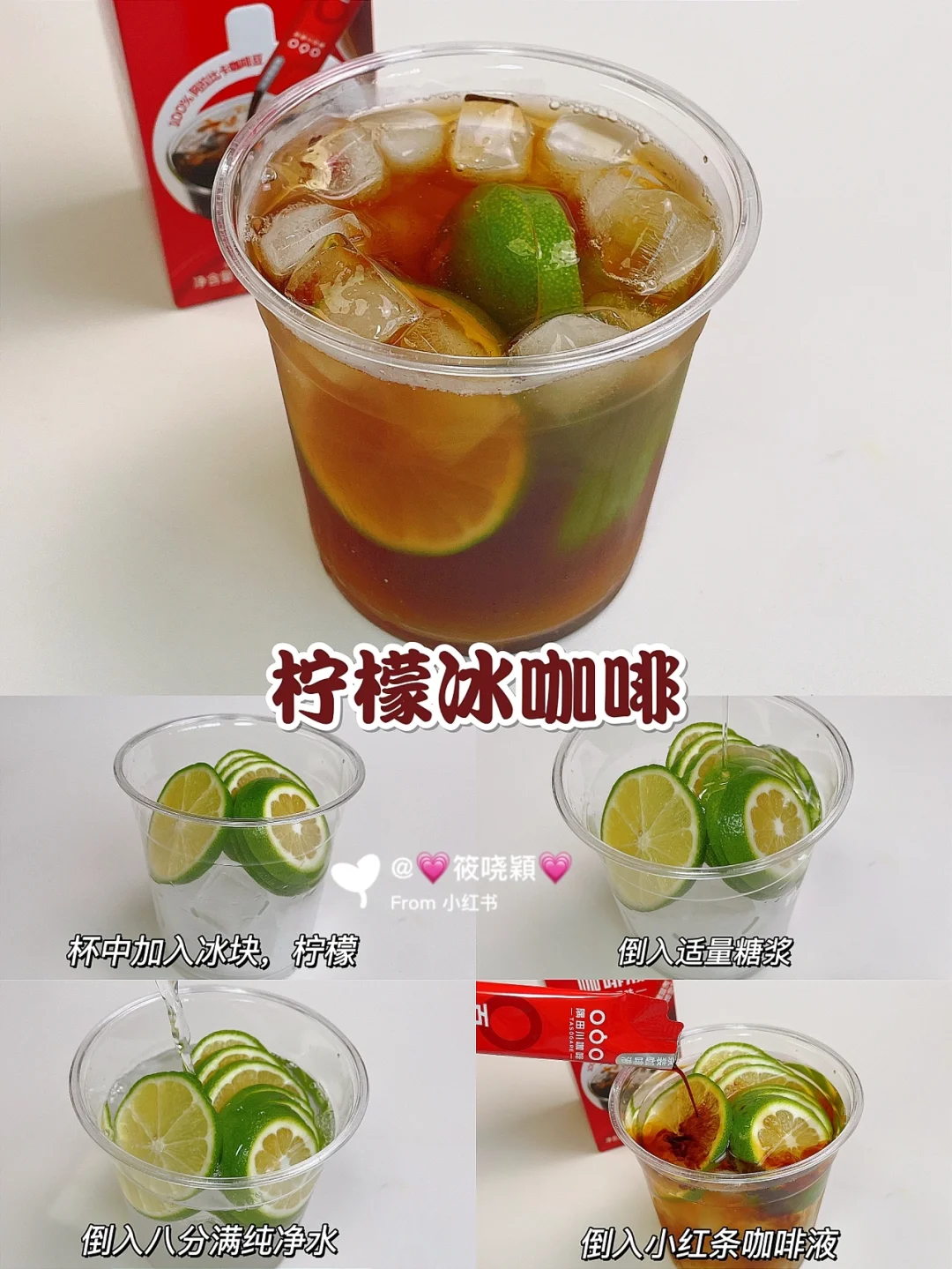 🔸做法:杯中加入冰块和柠檬,倒适量糖浆,加入纯净水八分满,倒入小红条咖啡液,喝前摇匀即可