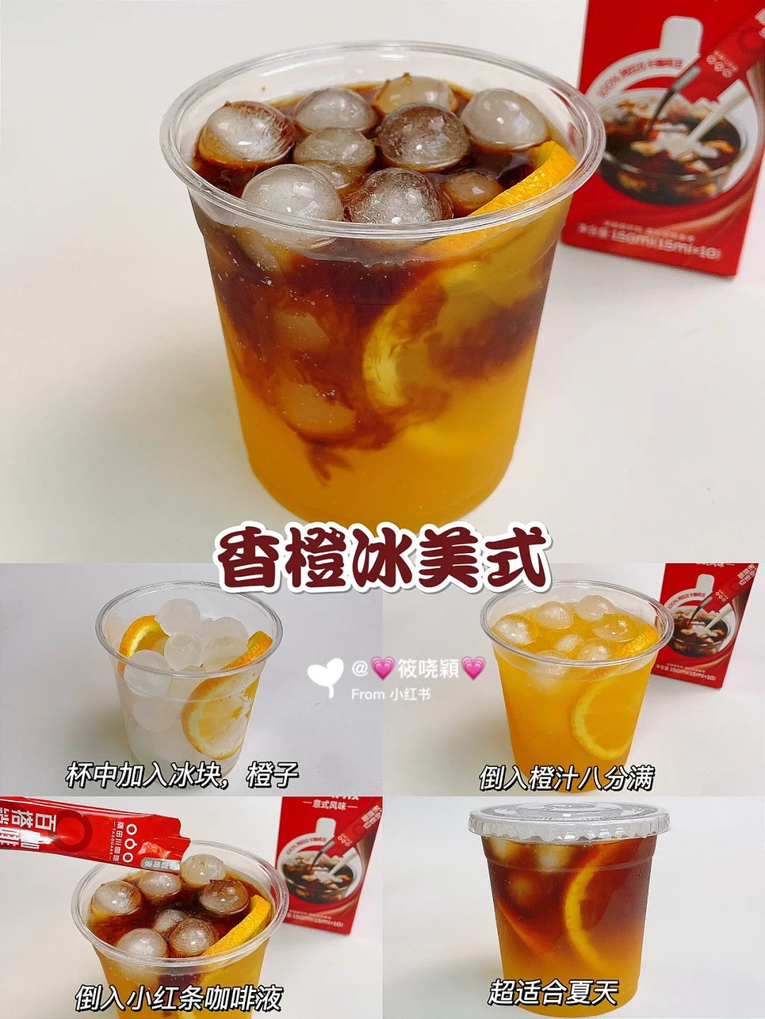 🔸做法:杯中加入橙子片和冰块,倒入橙汁八分满,最后加入小红条咖啡液清爽好喝,超适合夏天~