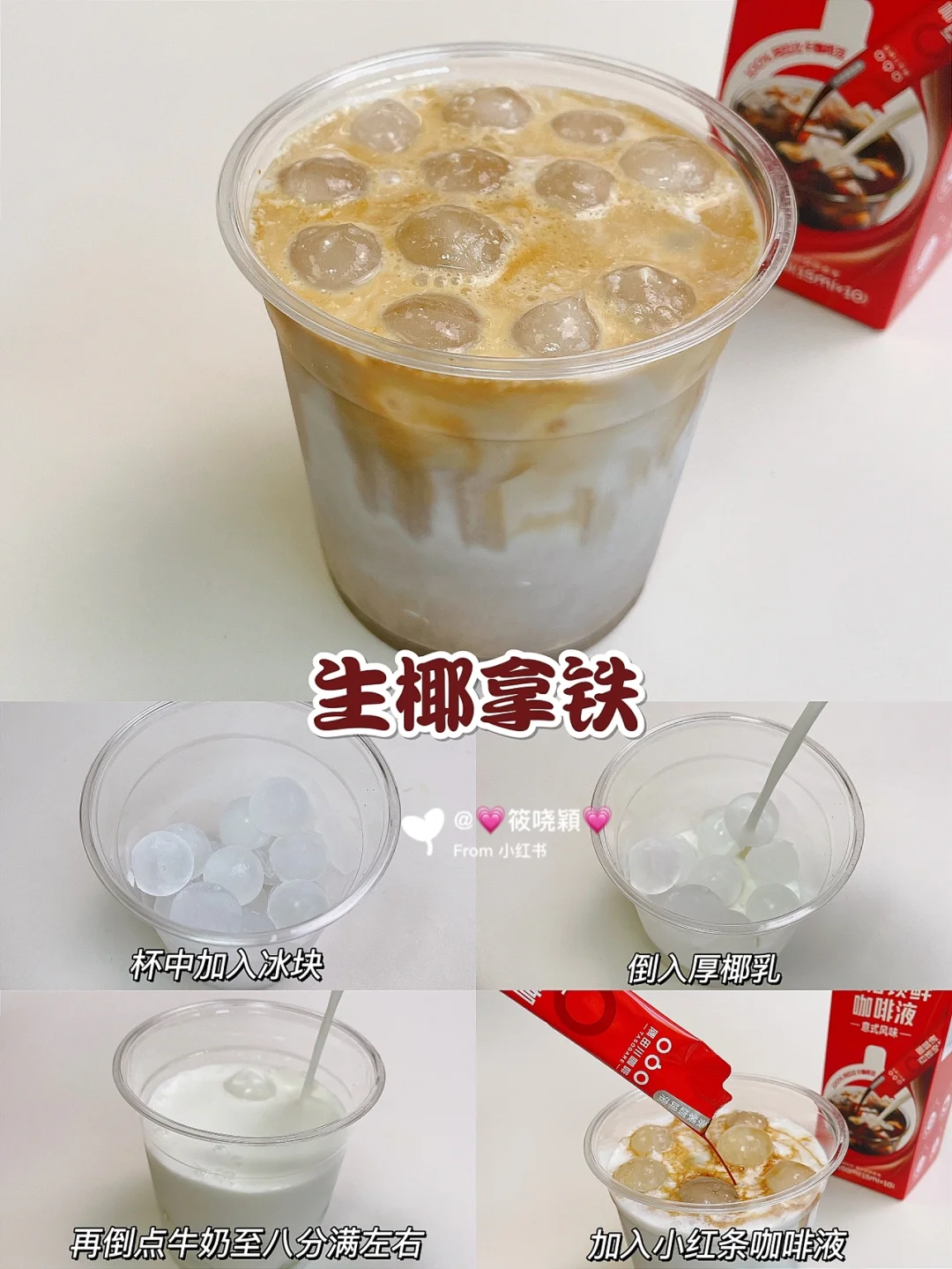 🔸做法:杯中加冰块,倒入半杯厚椰乳,加入牛奶至八分满,最后加入小红条咖啡液,太满足了!