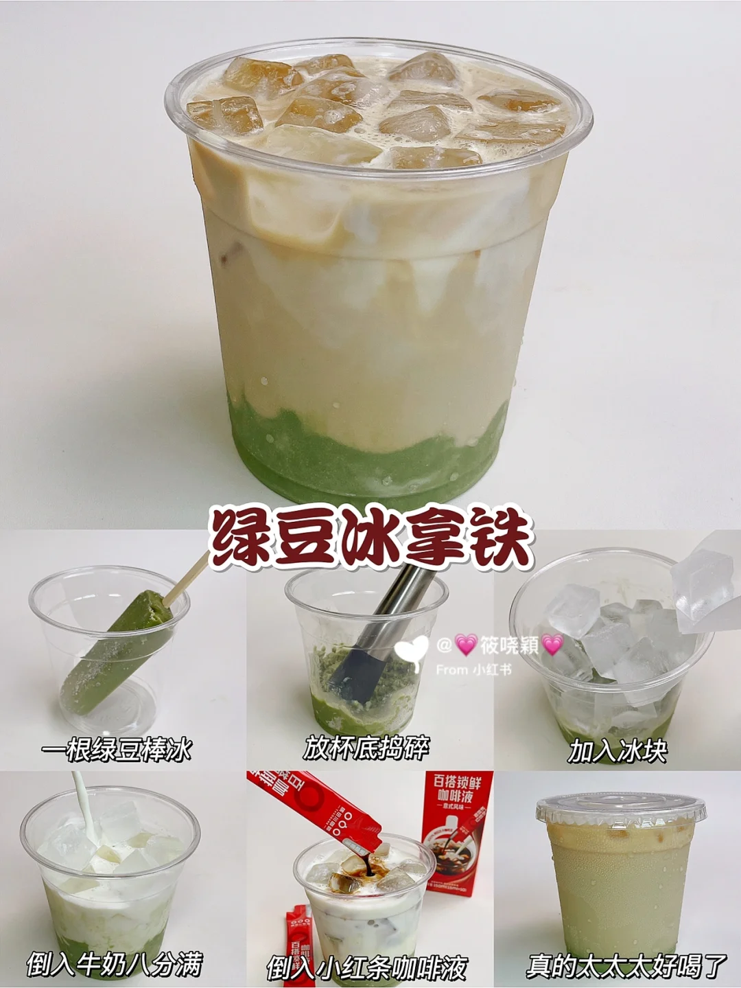 🔸做法:绿豆棒冰杯底捣碎,加入冰块,倒入牛奶八分满,最后加入小红条咖啡液,一定要试试,超好喝!