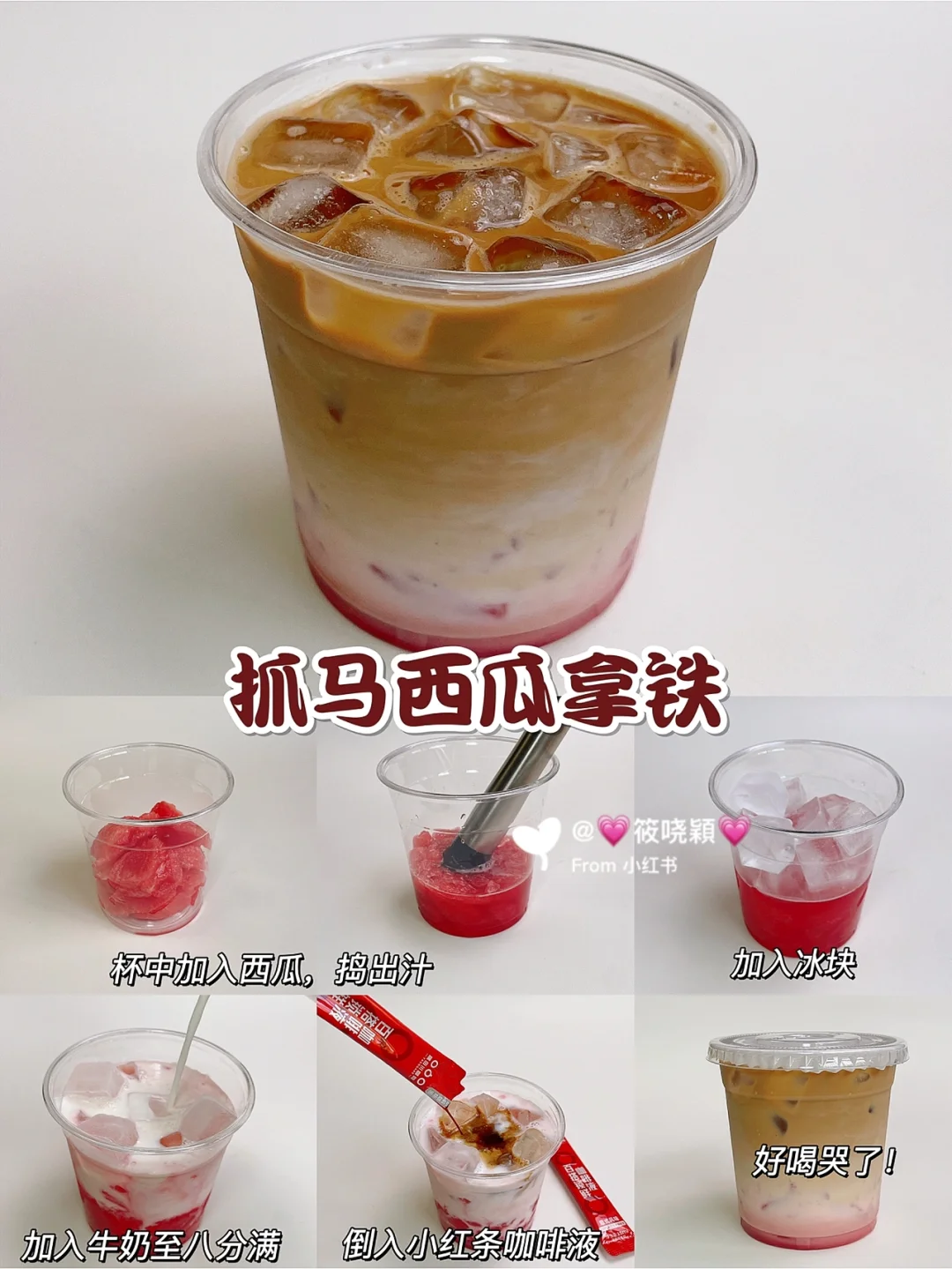 🔸做法:西瓜放杯底捣出汁,加入冰块,倒入牛奶八九分满,最后加入小红条咖啡液,真的好喝哭了!