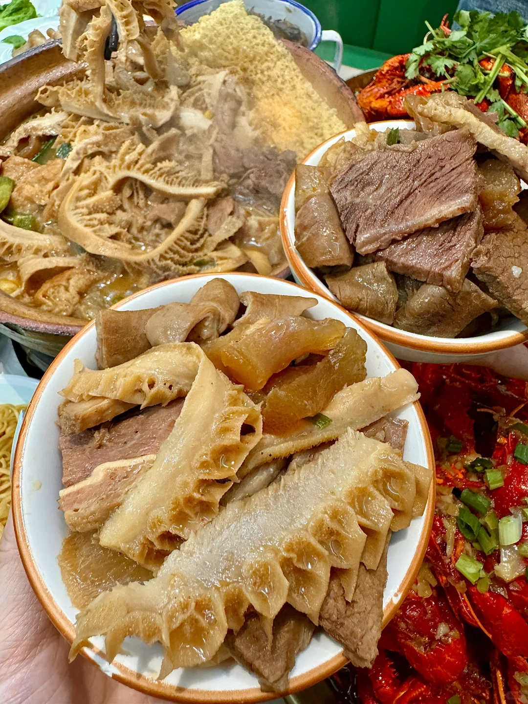 是我愿意反复去吃的牛杂煲小店没错了!!! 牛杂煲的份量真的太足了!咸淡刚好,鲜味十足! 里面有牛筋、牛肚、牛肉、牛内脏、萝卜、油豆腐…慢慢一大锅真的巨巨好吃!坠爱吃里面的牛筋好软糯~好吃到停不下来😭😭 还有夏天限定的小龙虾🦞推荐蒜蓉和干煸这两个口味!小龙虾个头很大,每只都是开了背的!干煸味辣的敲过瘾。。。香迷糊了!