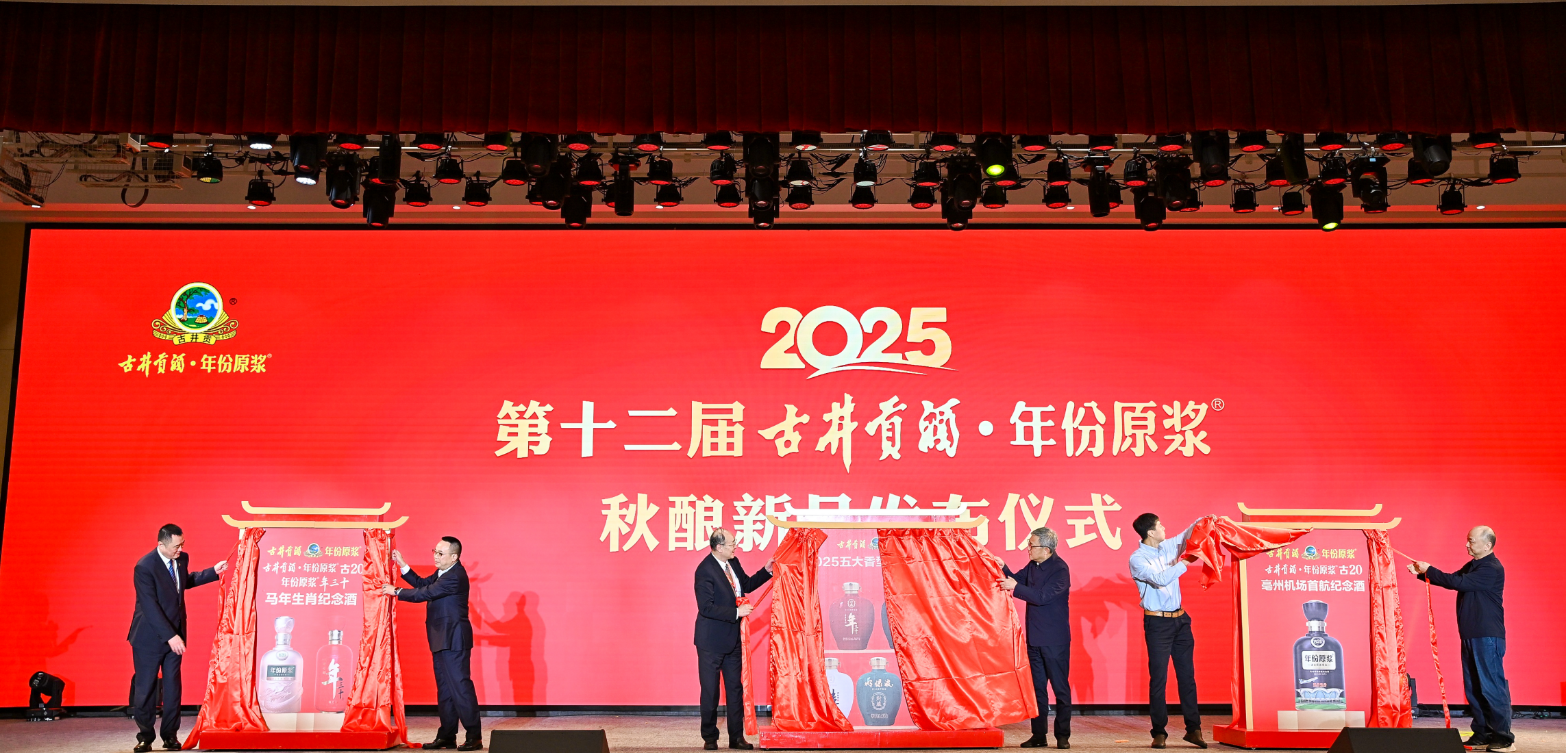 秋酿盛典高潮时,现场屏幕上依次播放安徽亳州、安徽滁州、湖北咸宁、贵州茅台镇秋酿现场画面——今年,古井贡酒秋酿首次实现“四地同酿”,八大生产基地遥相辉映,六大香型各展风采。