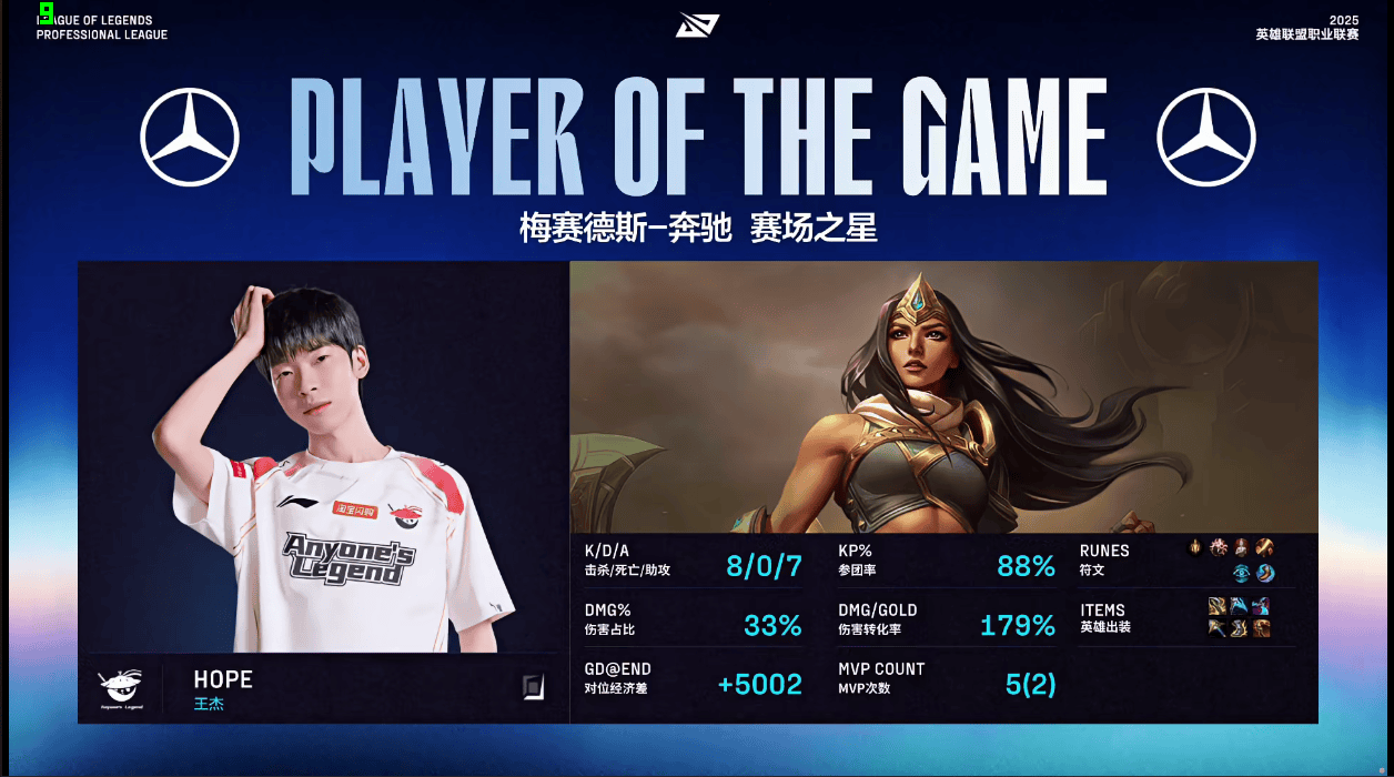Hope使用希维尔打出8/0/7战绩,斩获AL对阵TES第二局MVP