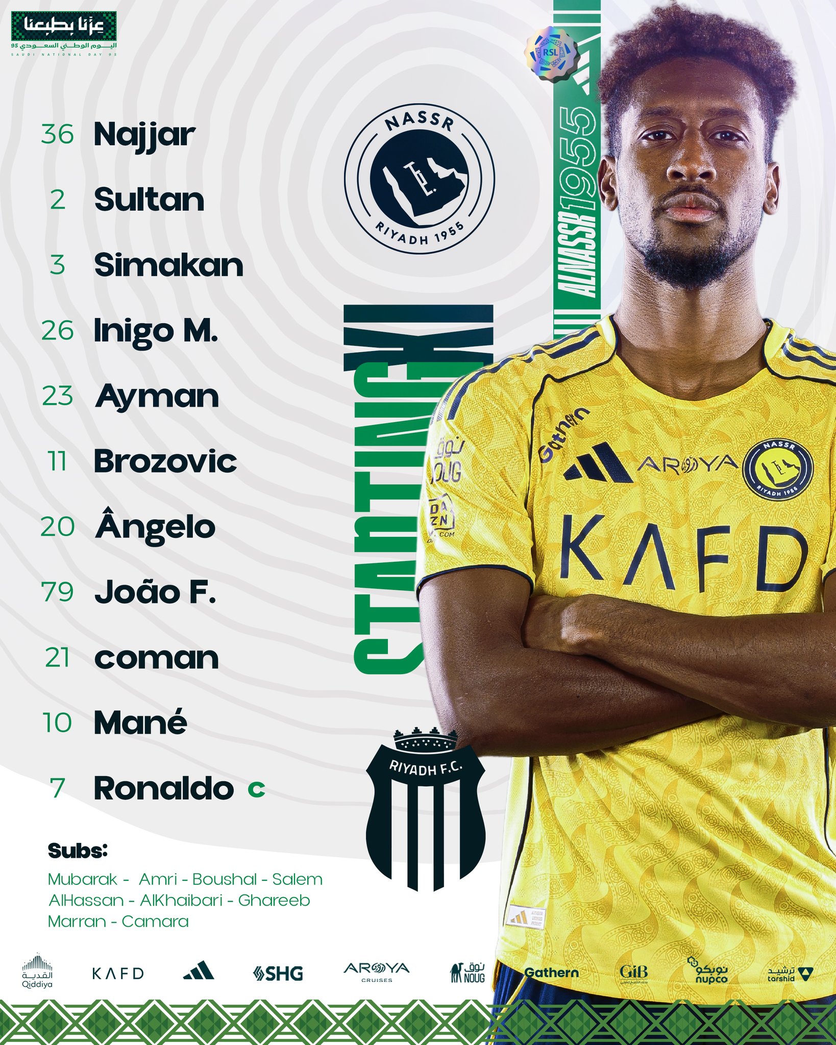 利雅得胜利首发:36-纳贾尔、2-苏丹·哈纳姆、3-西马坎、26-伊尼戈、23-叶海亚、11-布罗佐维奇、20-安吉洛、79-菲利克斯、21-科曼、10-马内、7-C罗