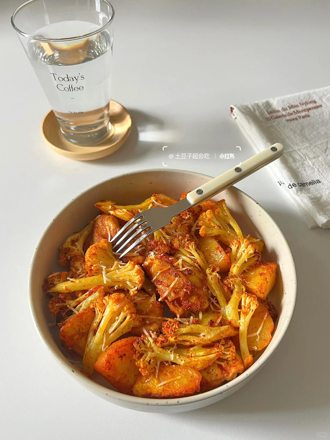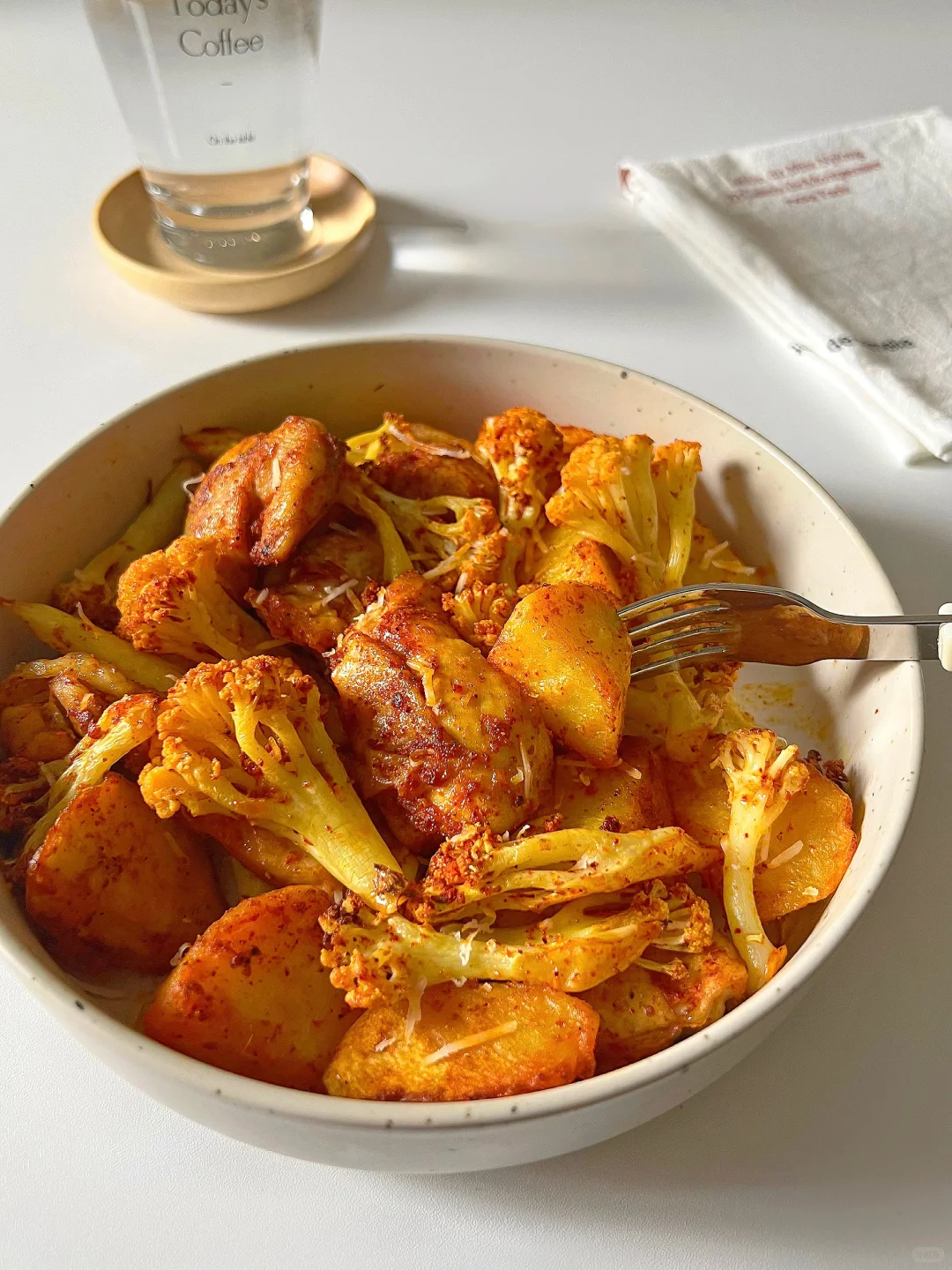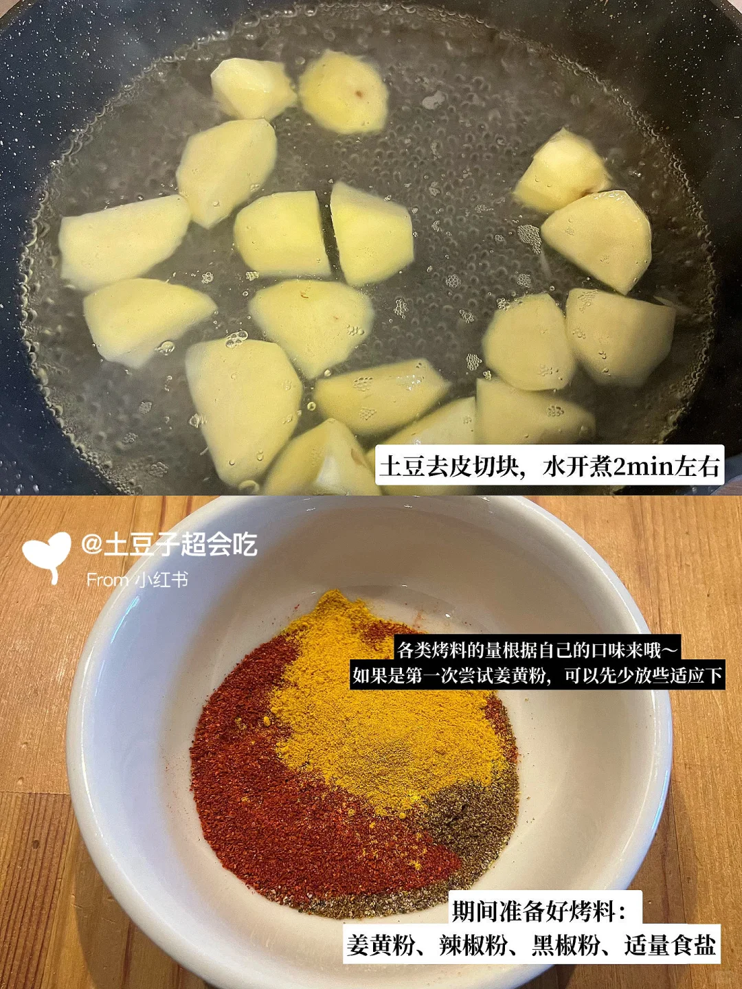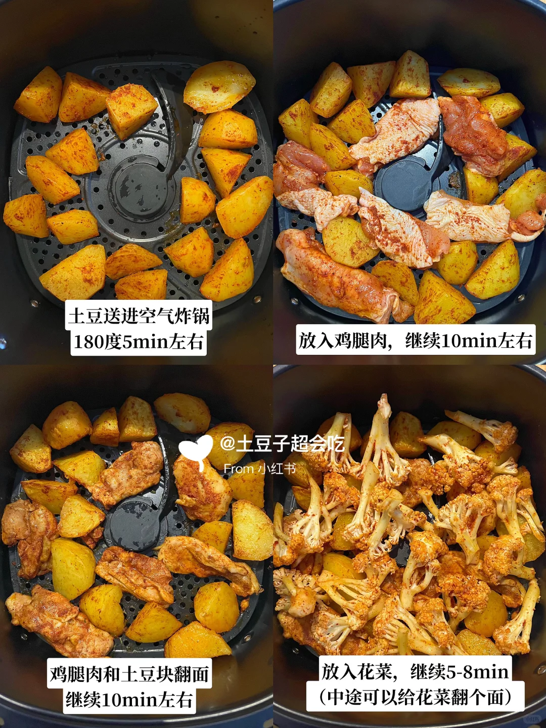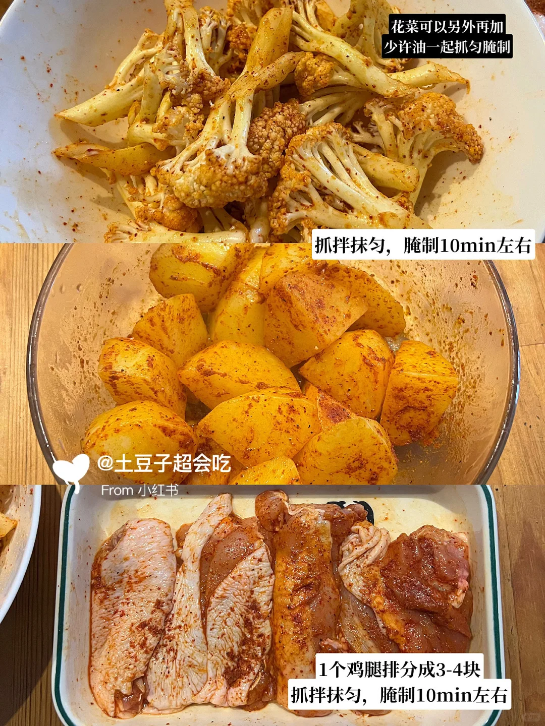 🥦 食材:土豆、花菜、鸡腿、姜黄粉/辣椒粉/黑椒海盐