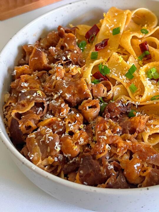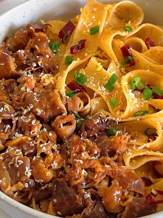 6️⃣ 装盘后撒少许葱花,擦少许帕玛森干酪(增香,可省略)、柠檬皮(提味解腻,推荐!)。