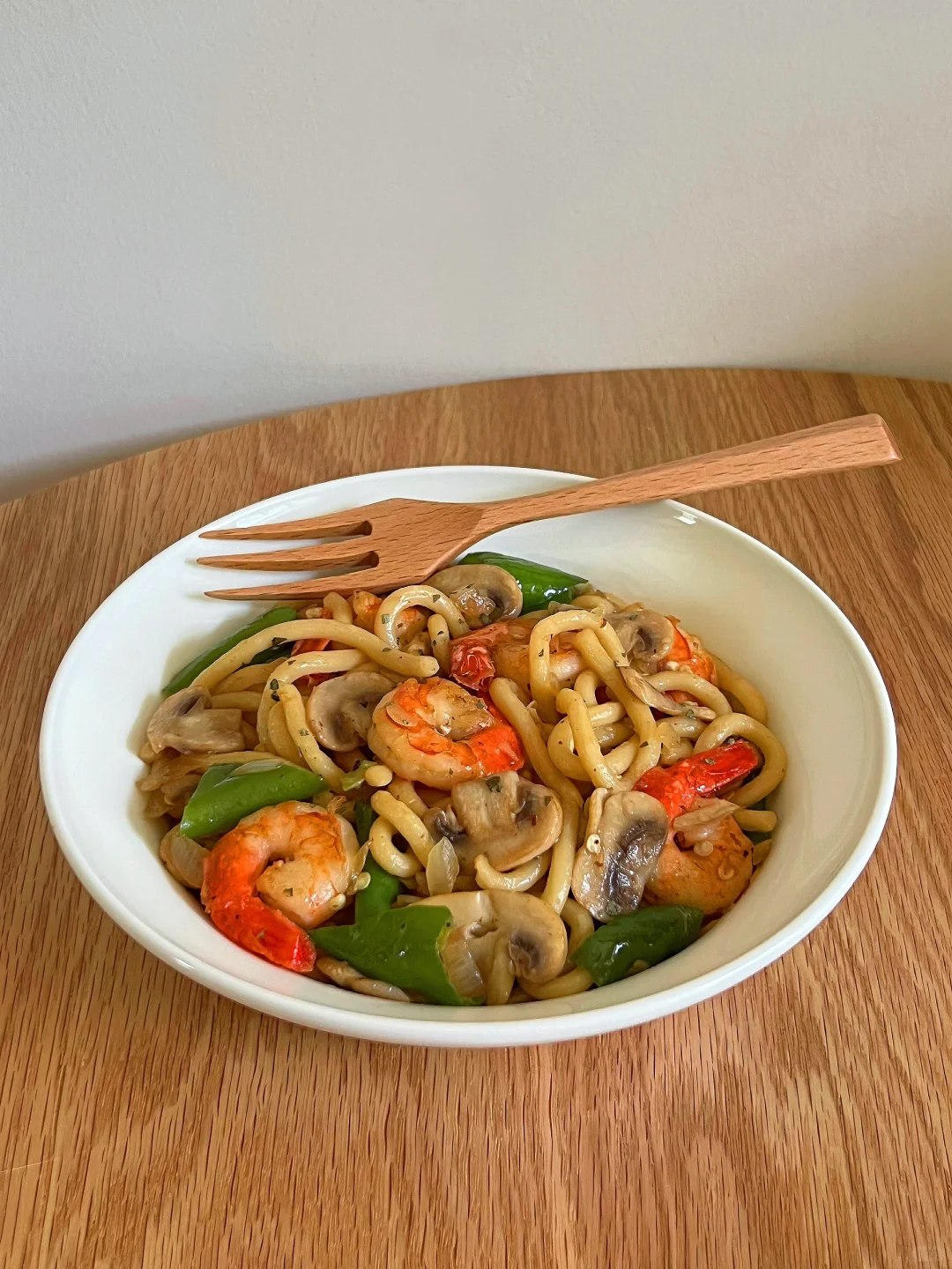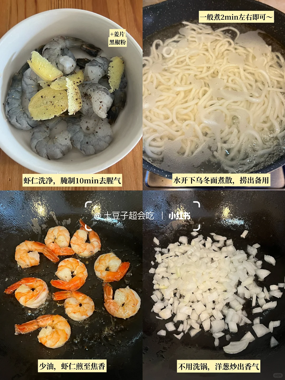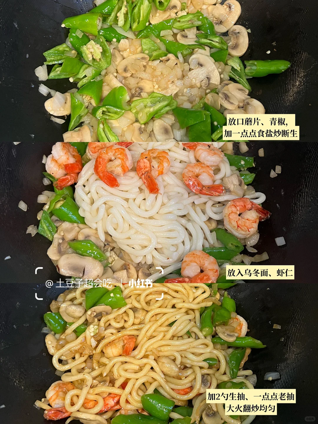 🍤 主要食材:乌冬面、虾仁、青椒、口蘑、洋葱