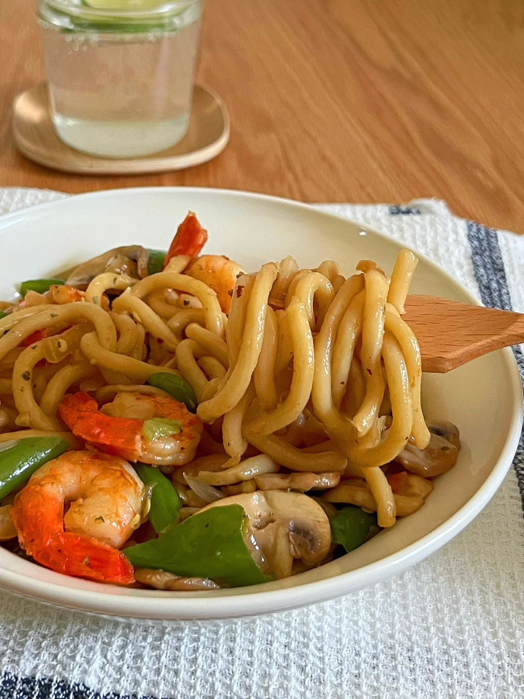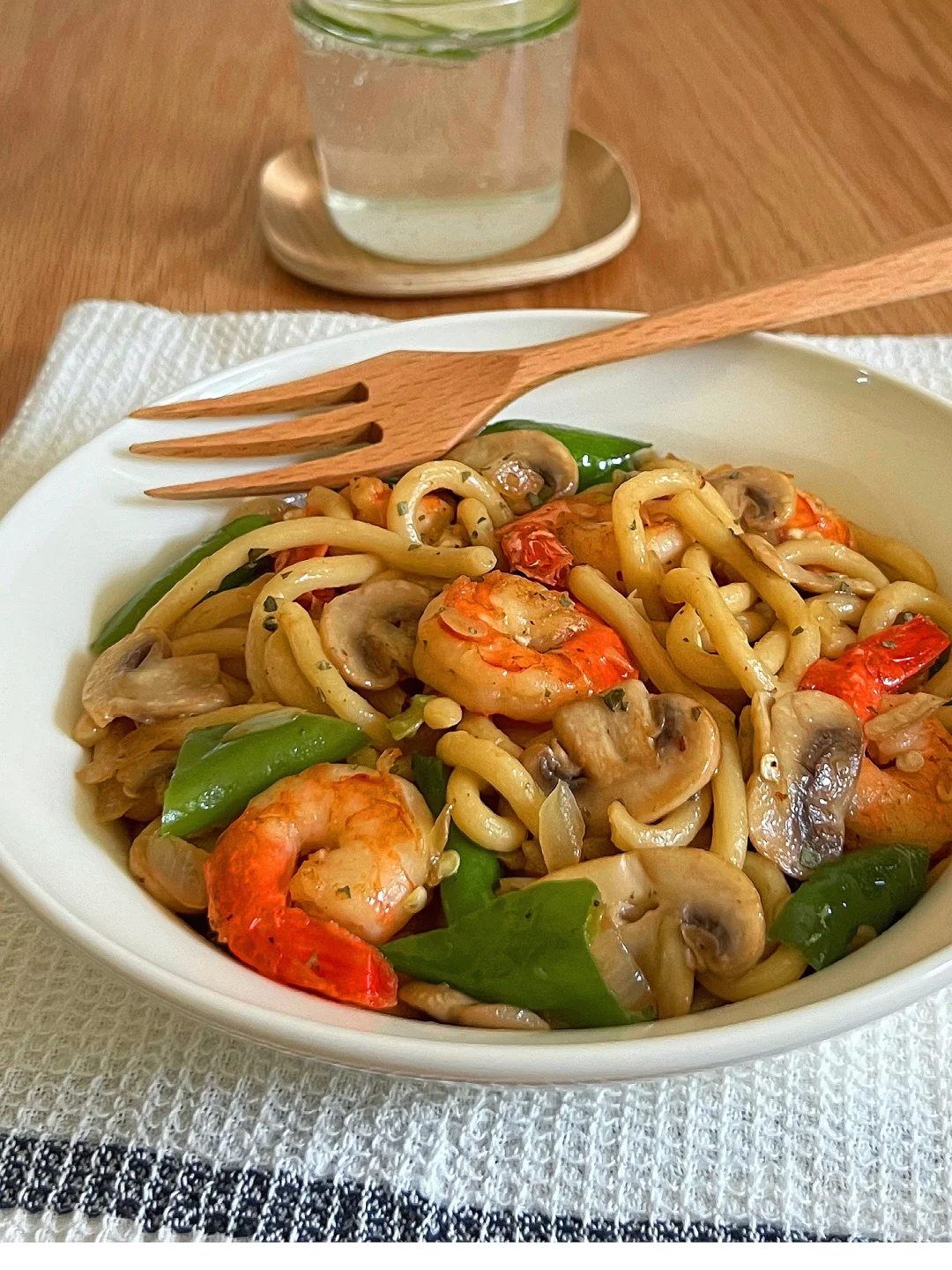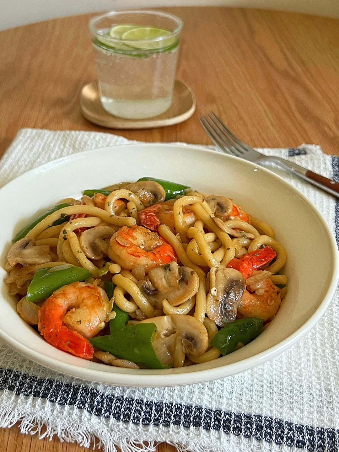 🍤 主要食材:乌冬面、虾仁、青椒、口蘑、洋葱