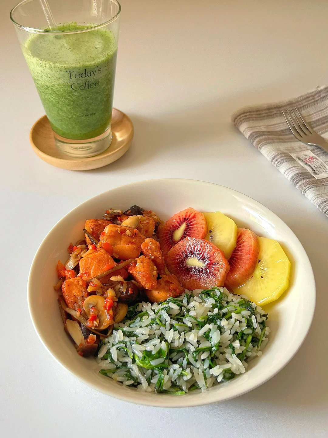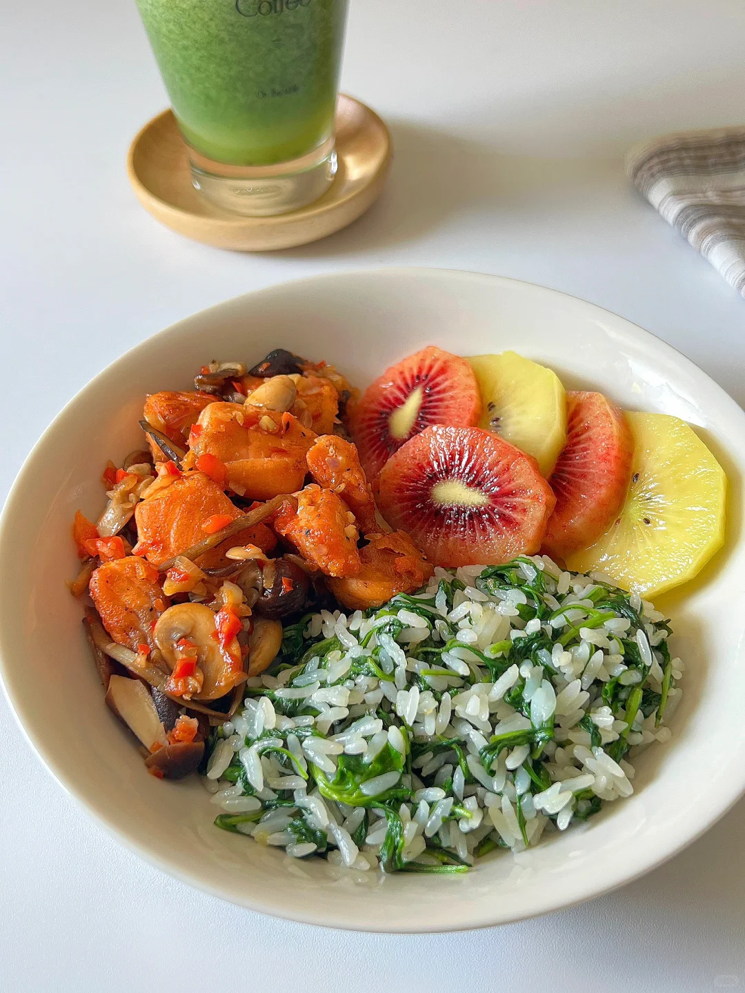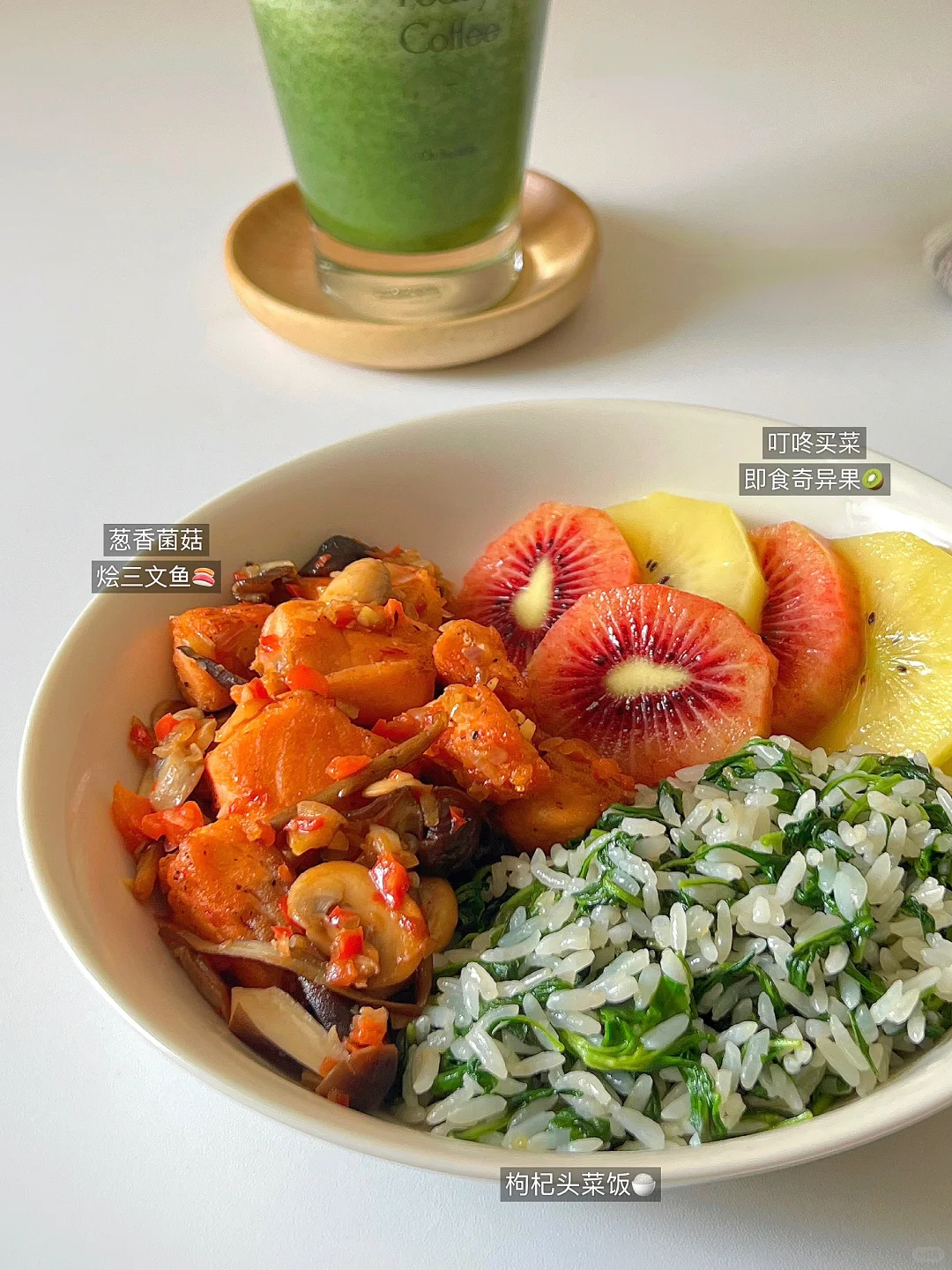 葱香菌菇烩三文鱼➕枸杞头菜饭➕奇异果