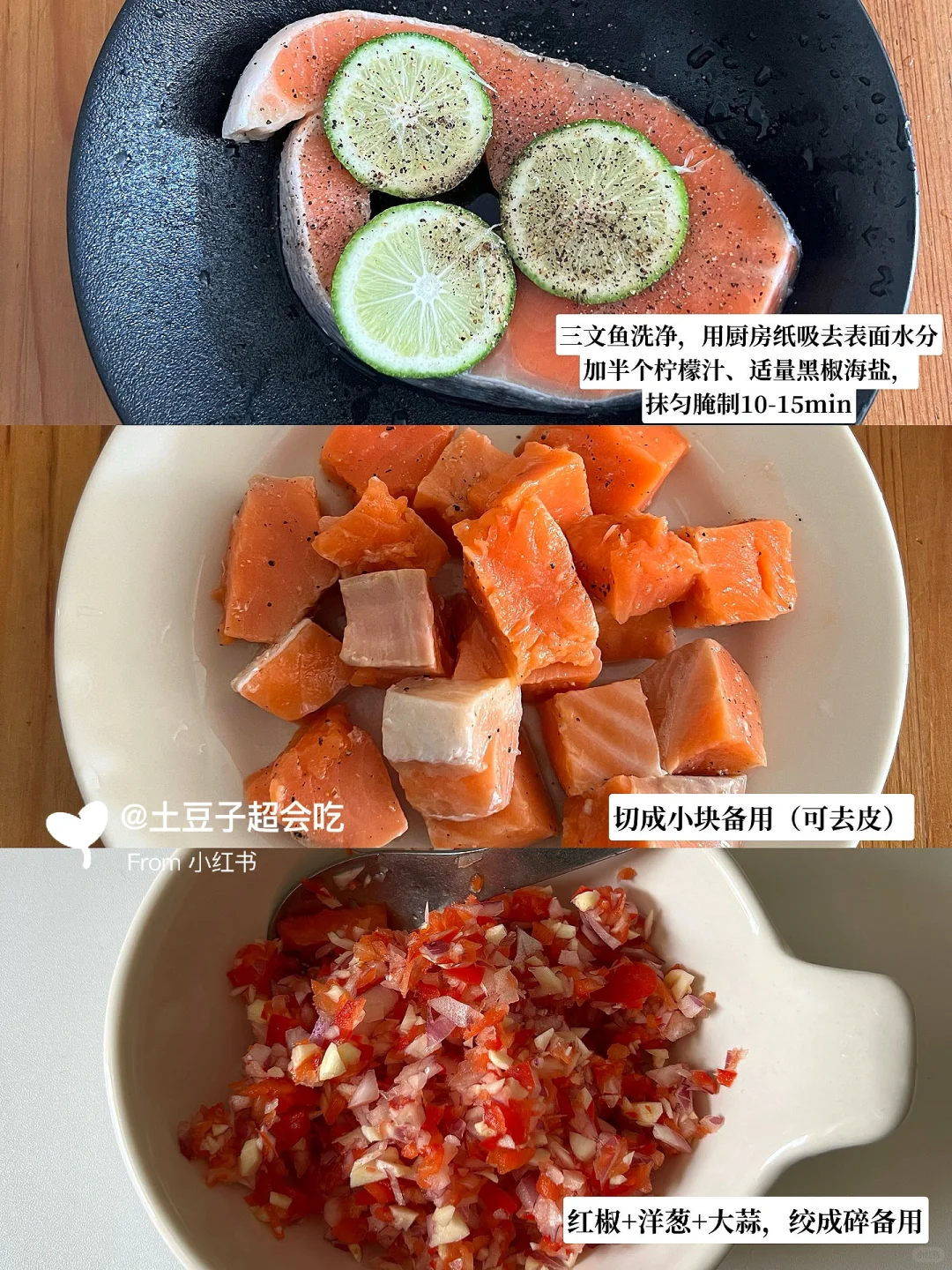 1️⃣ 三文鱼洗净,用厨房纸吸去表面多余水分,然后挤上半个柠檬汁、加适量黑椒海盐,抹匀腌制10-15min;腌制完成后将三文鱼切成小块备用;