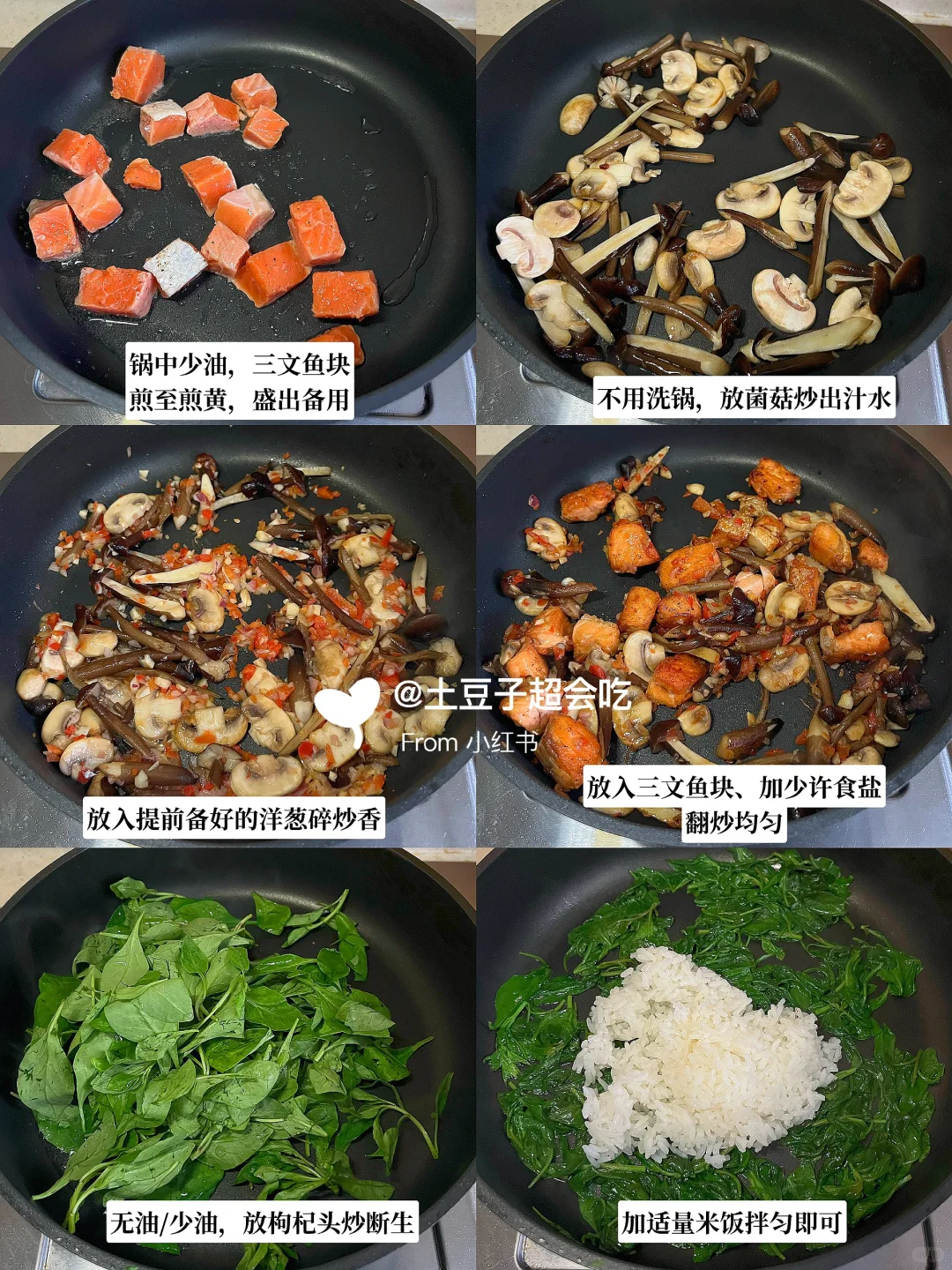 4️⃣ 不用洗锅,放入菌菇炒出汁水;然后放入备好的洋葱碎炒香;最后放入三文鱼块,加少许食盐,翻炒炒匀;