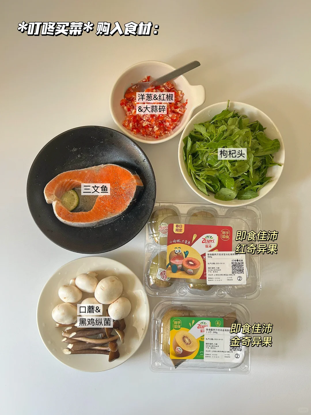 🥝 叮咚买菜购入食材:即食佳沛奇异果、三文鱼、菌菇、枸杞头、红椒/洋葱/大蒜/柠檬
