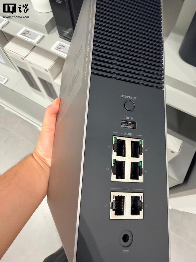 这款路由器背面提供了4个2.5G网口和2个10G网口,而且底部还配备了一个M2的SSD接口。截至发稿,IT之家未能在网上找到任何关于这款路由器的信息,后续将保持关注。