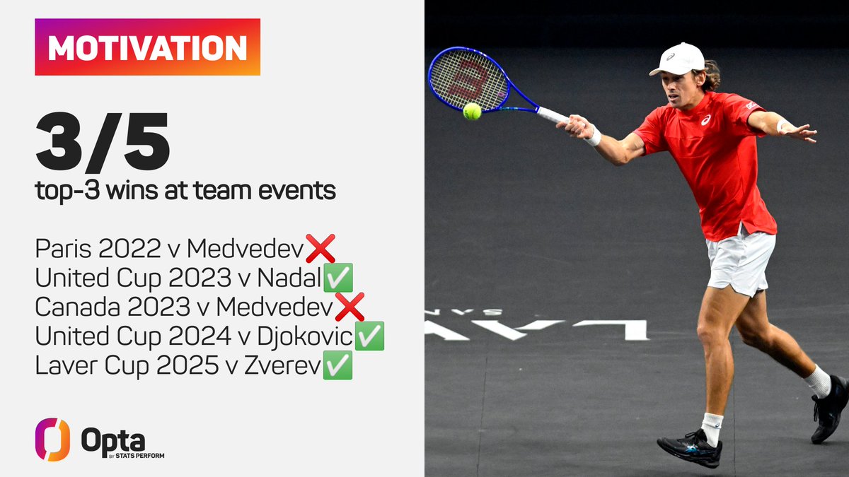 记者OptaAce(网球)发推特报道,3/5-亚历克斯·德米纳尔取得了职业生涯第五次对阵世界前三选手的胜利,其中三次来自团体赛事。斗志昂扬。#LaverCup|@LaverCup@TennisAustralia
