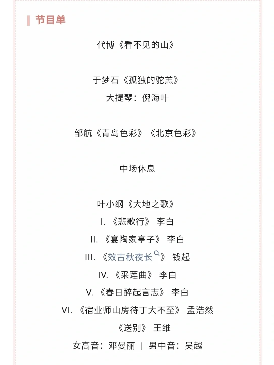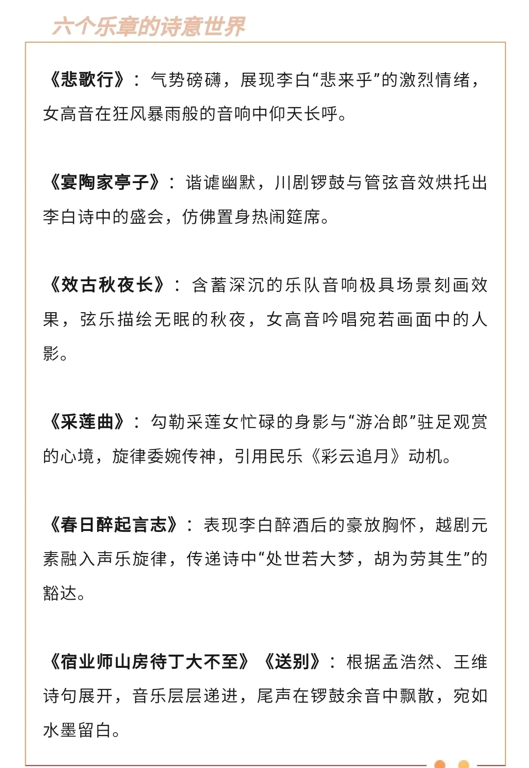 从《悲歌行》中女高音撕裂风雨的呼喊,到《采莲曲》里《彩云追月》的婉转动机;再在《春日醉起言志》里融入越剧的醉意洒脱,最后到终曲《送别》余音如水墨般淡出……六个乐章,带来六重意境!