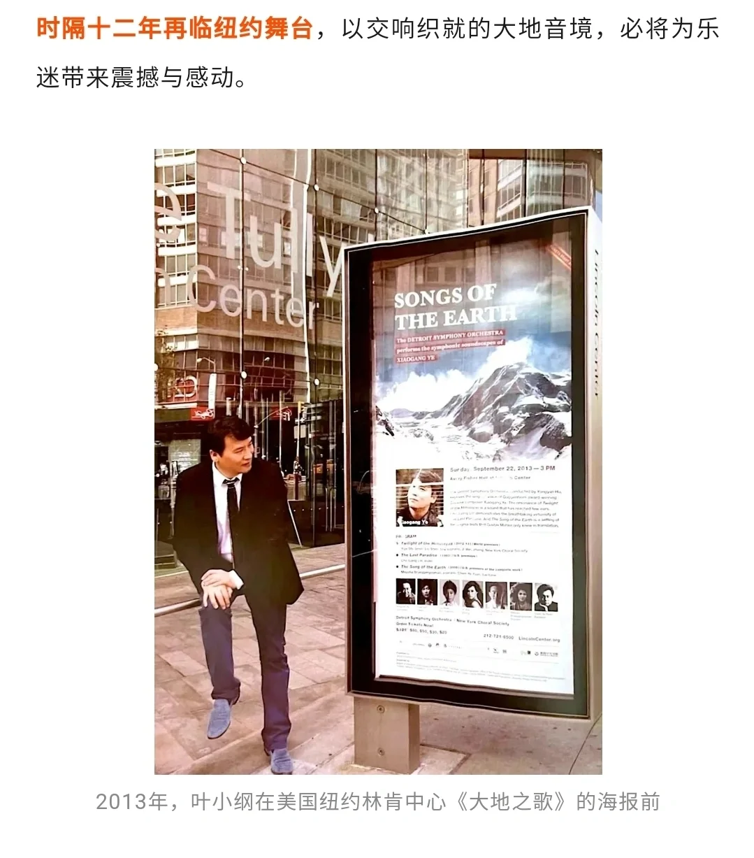 9月28日下午3点,开幕音乐会将由指挥家蔡金冬执棒,以叶小纲2005年创作的《大地之歌》作为压轴之作。时隔十二年再临纽约舞台,太值得期待了!