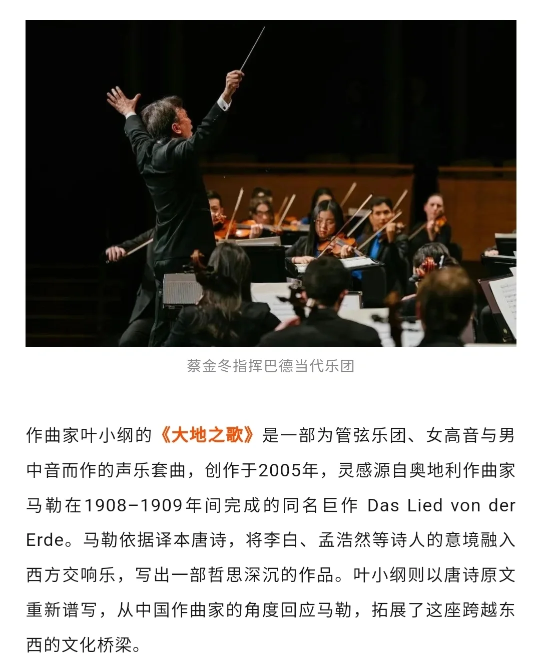 🔥《大地之歌》是一部向马勒同名杰作致意、却以唐诗原文重新谱写的声乐套曲,不只是东西方音乐的对话,更是一场跨越百年的精神共鸣。
