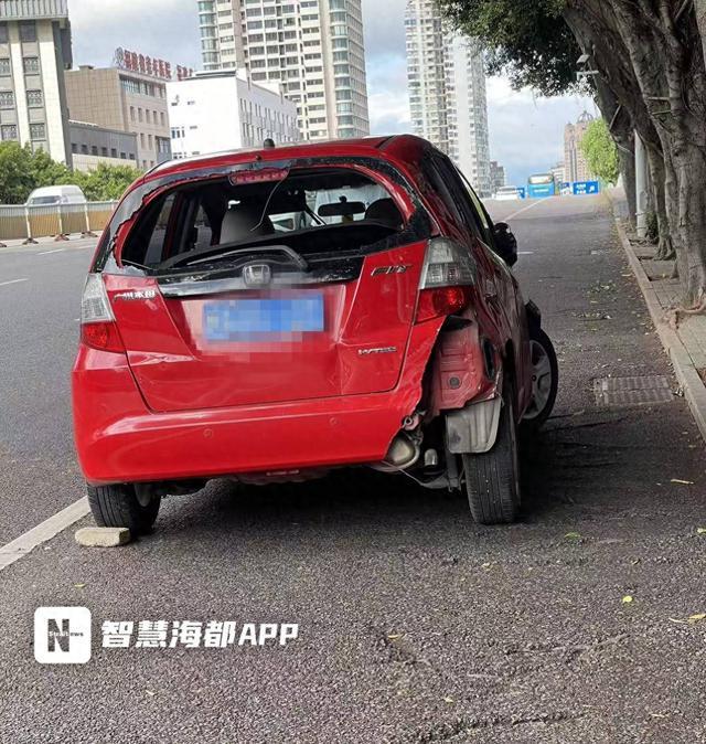 在路边,记者看到了事故车辆。红色小车车尾严重破损,右后侧车身完全凹陷,右侧车身因蹭地留下大量刮痕,右后视镜破损,左前轮严重变形。面对记者采访,女司机未作答复。