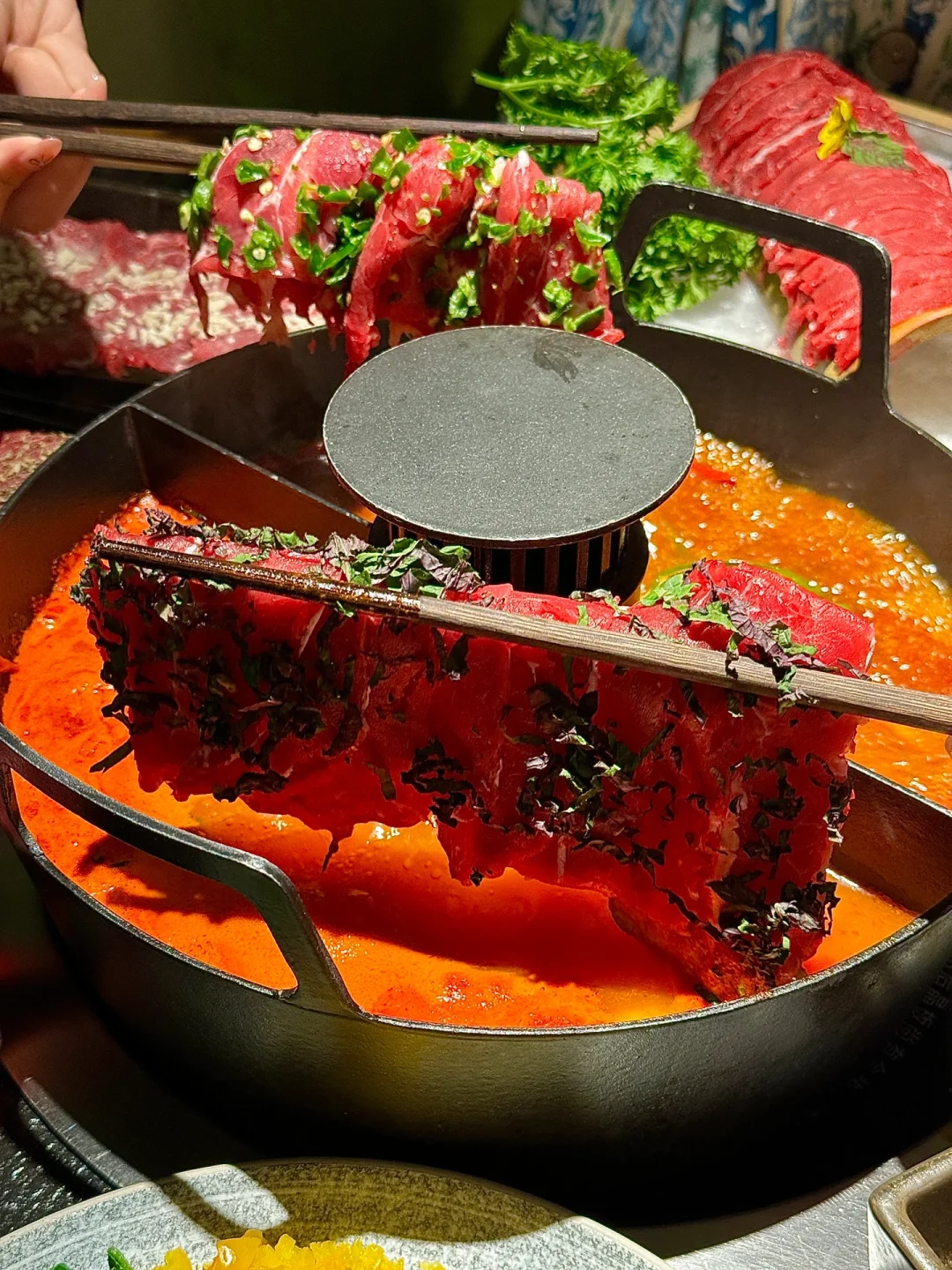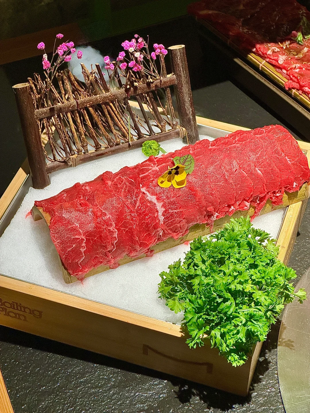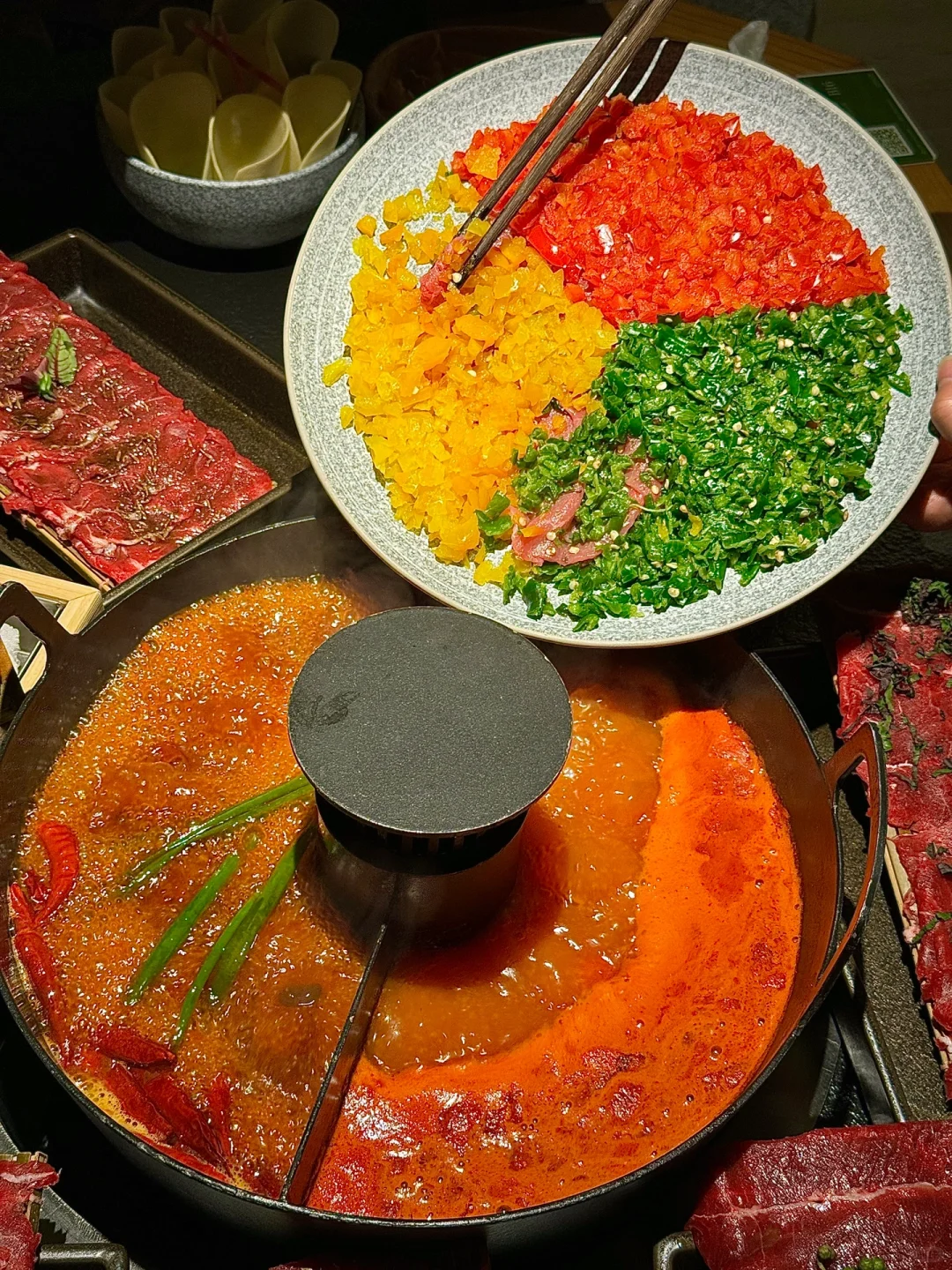 滨江天街新开的!森系火锅真的好好吃啊!! 人均100就能吃到新鲜现做的山野火锅🍲真的牛! 各种甜品饮料都现点现做好喝又好看嘞! 牛肉更没得说!肉质巨巨巨新鲜! 推荐招牌八秒牛肉、木姜子牛肉、紫苏牛肉、三色椒牛肉、罗勒牛肉!都很好吃😋!! 是我愿意带朋友去无数次的店没错了!!!